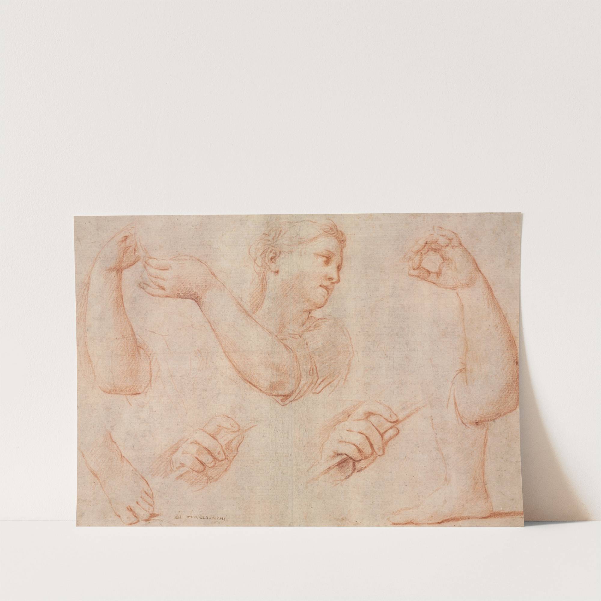 Study of a Young Woman Playing a Tambourine, and Studies of an Arm, Hands, and Feet (Studies for “Miriam Leading the Chorus of Women Who Give Thanks for the Routing of Pharoah” by Marcantonio Franceschini - Wall Art Print