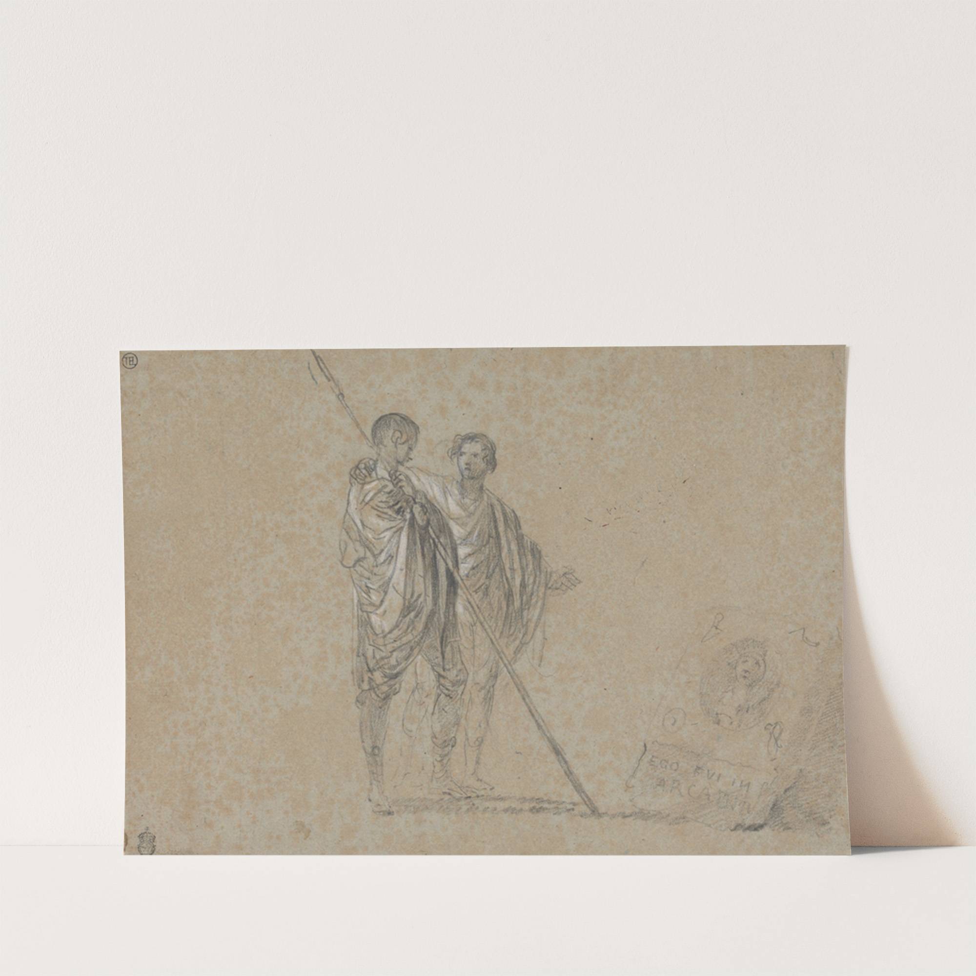 This art print showcases a delicate pencil drawing titled "Study of Figures for 'A View of the Campagna'" by renowned artist Richard Wilson. The composition features two male figures standing closely together, engaged in a conversation or interaction. Both men...
