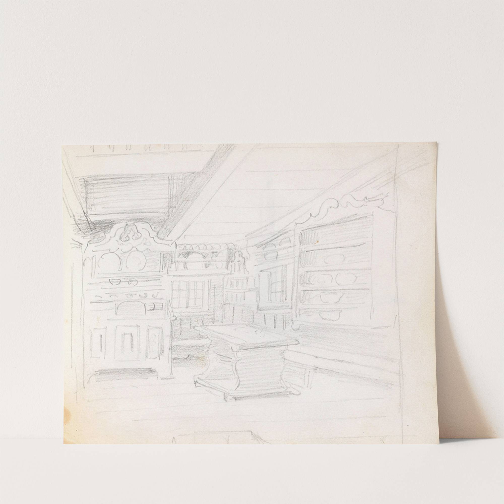 This art print features a delicate, monochromatic sketch titled "Stueinteriør (1848)" by Adolph Tidemand. The black line drawing captures the intricate details of an interior space, showcasing architectural elements and subtle textures. Fine, precise lines create a sense of depth...