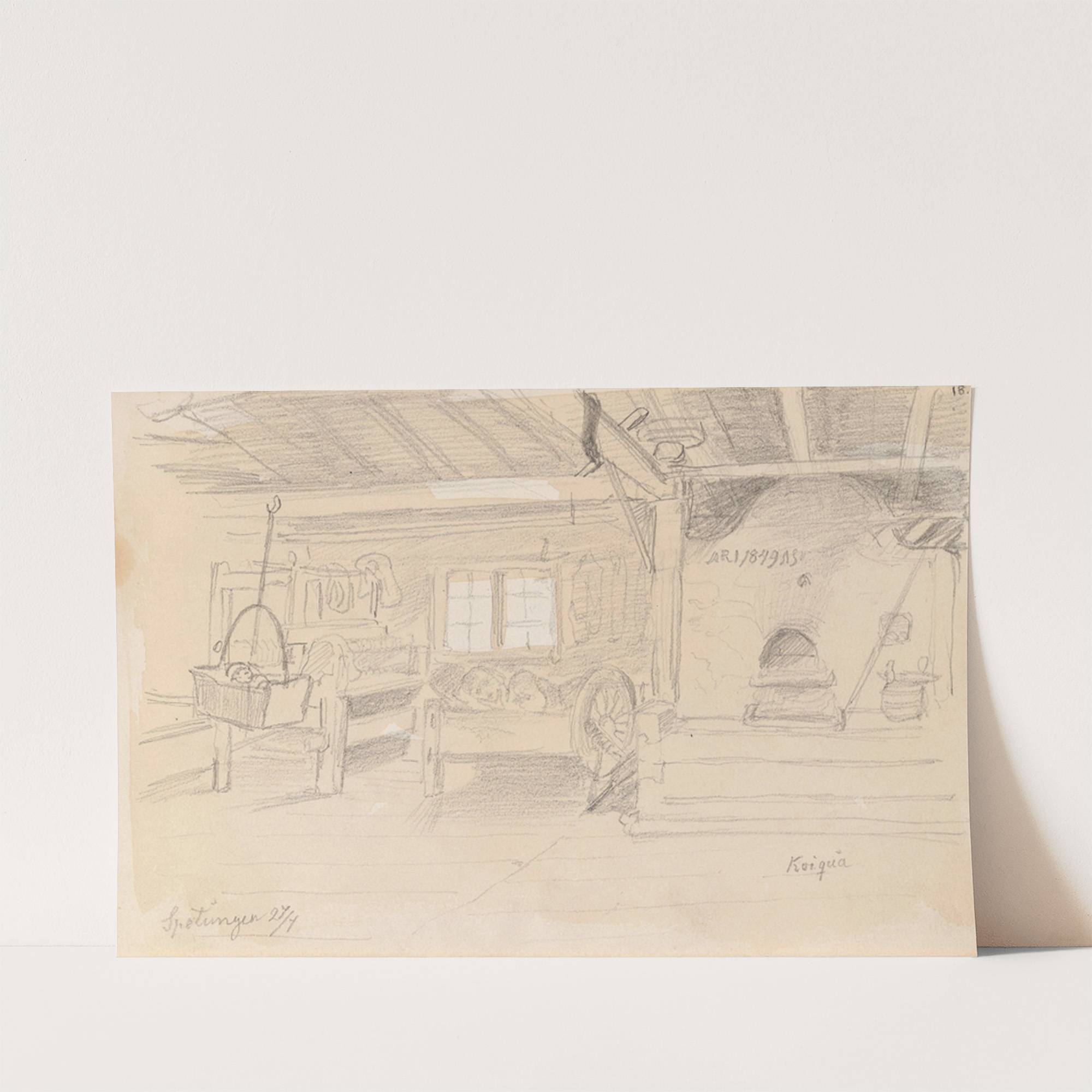 This art print showcases "Spättungen" by Adolph Tidemand, capturing the essence of a rustic, cozy interior scene from 1852. The delicate pencil sketch highlights an old wooden kitchen with traditional furnishings and natural light streaming through a simple window in...