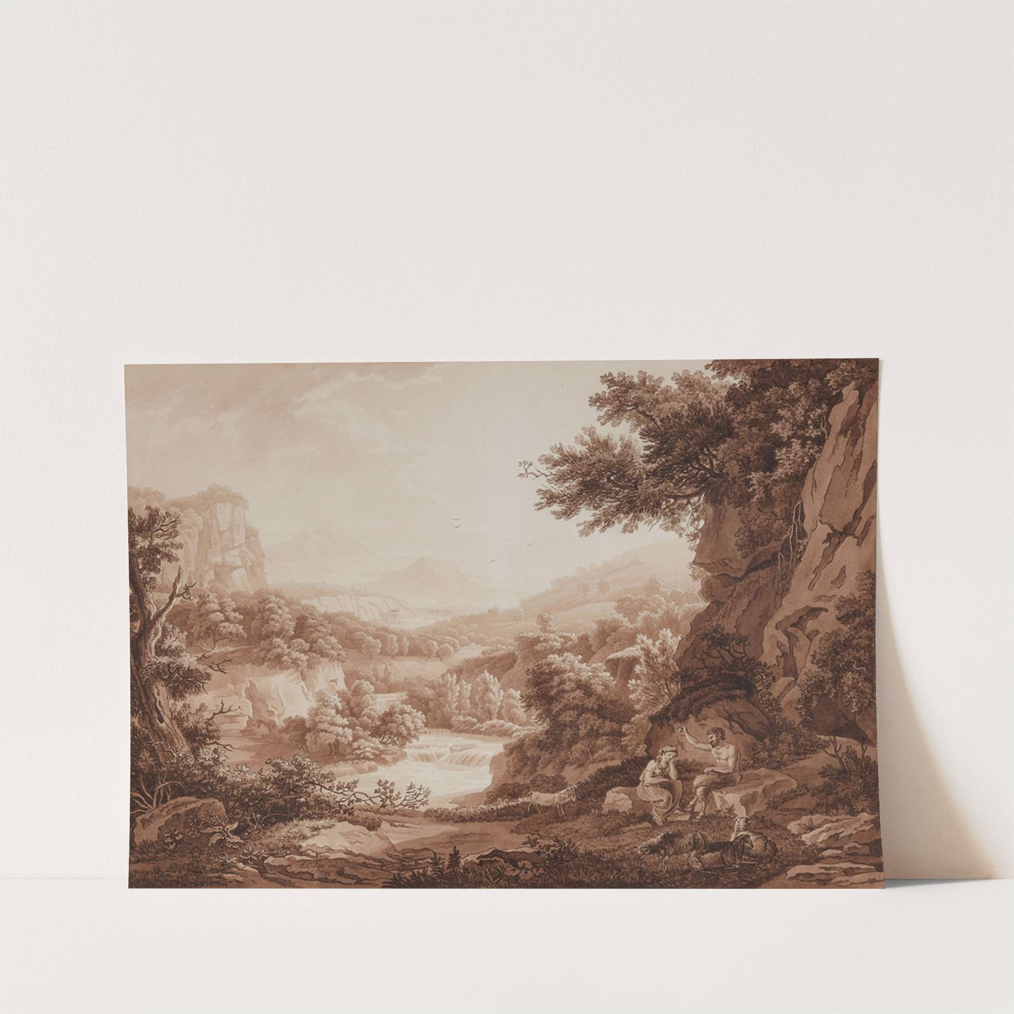 This sepia-toned art print depicts a tranquil landscape scene titled "S?dliche Landschaft mit Satyr und einer Sch?fin" by Albert Christoph Dies, created in 1787. The artwork showcases a serene valley filled with lush trees and rocky terrain leading to a...