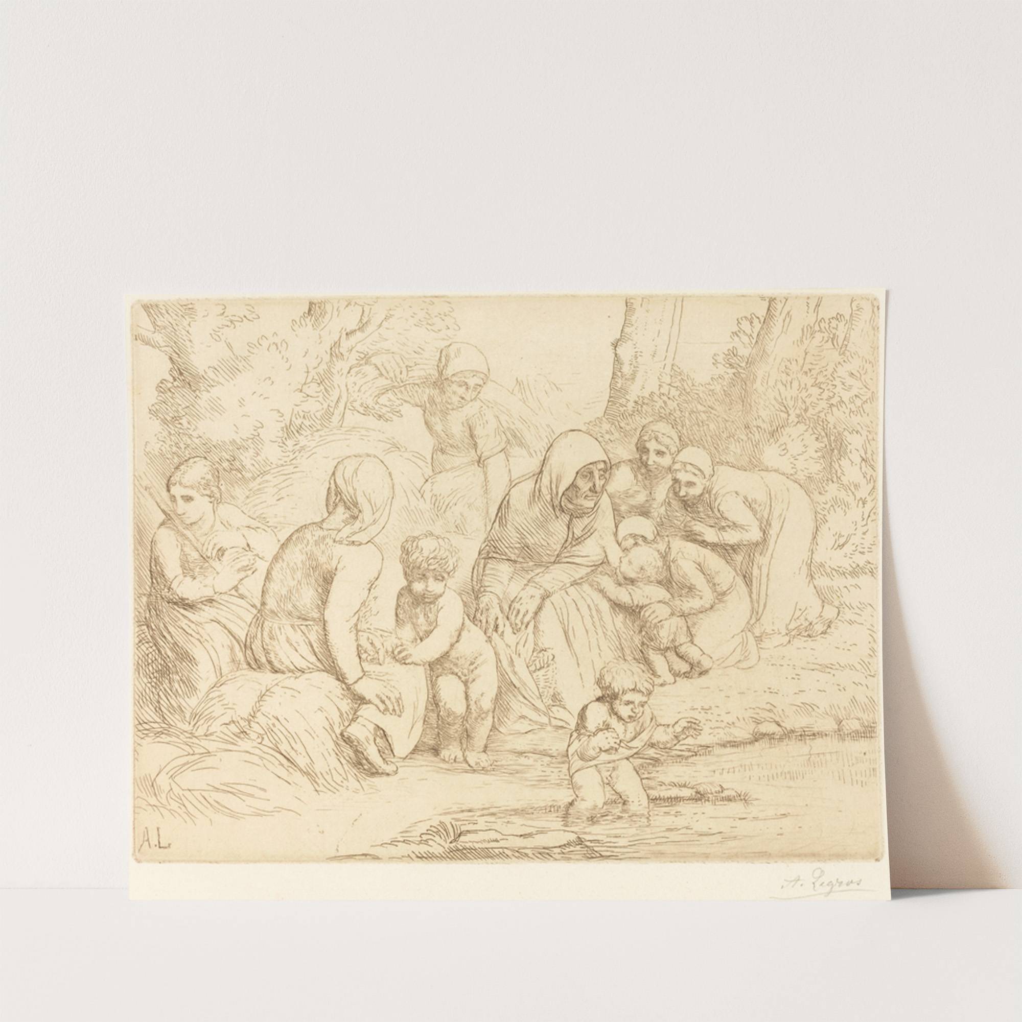 This art print showcases "Summer (L'été)" by renowned French artist Alphonse Legros. The monochromatic drawing, executed in fine pencil lines, captures a serene outdoor scene featuring a group of people gathered near a gentle stream. At the forefront, two children...