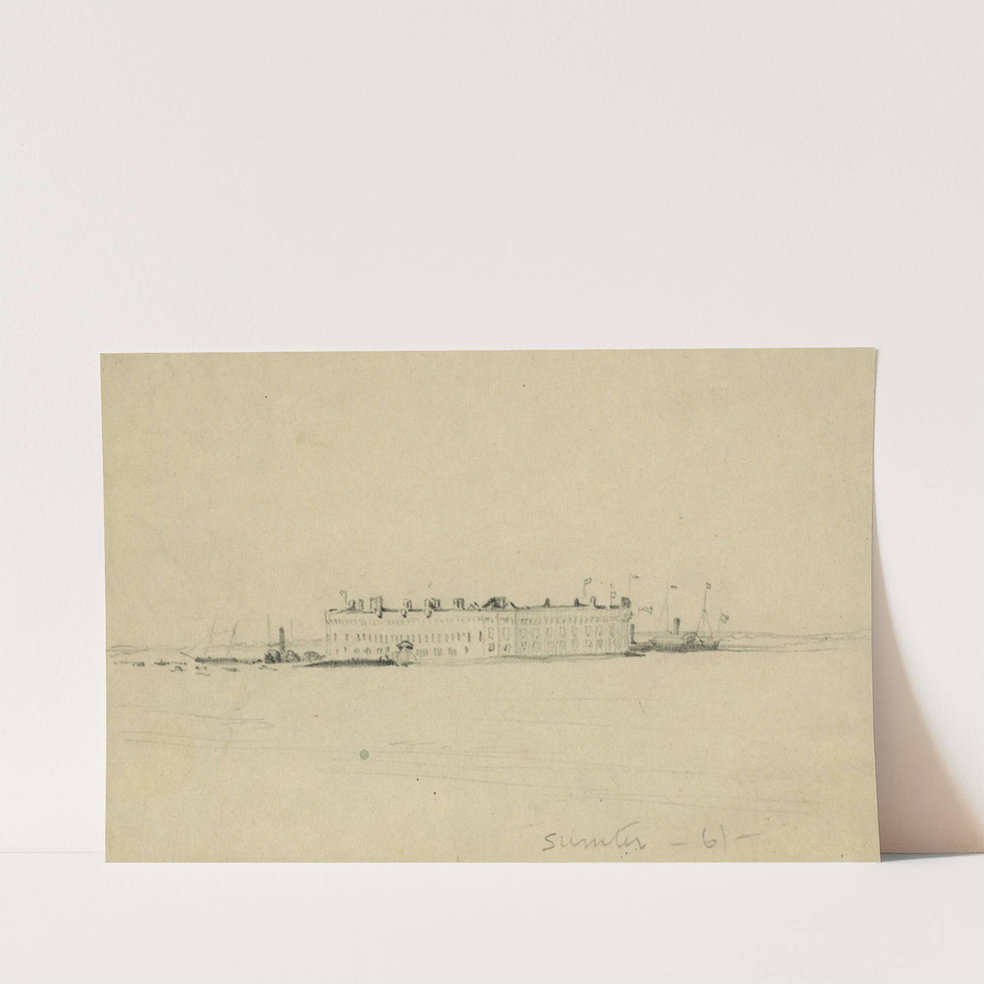 This artwork is a delicate pencil drawing of the ship "Sumter" by Alfred Rudolph Waud. The drawing features a large naval ship stationed on what appears to be a calm body of water, with subtle hints of land in the...