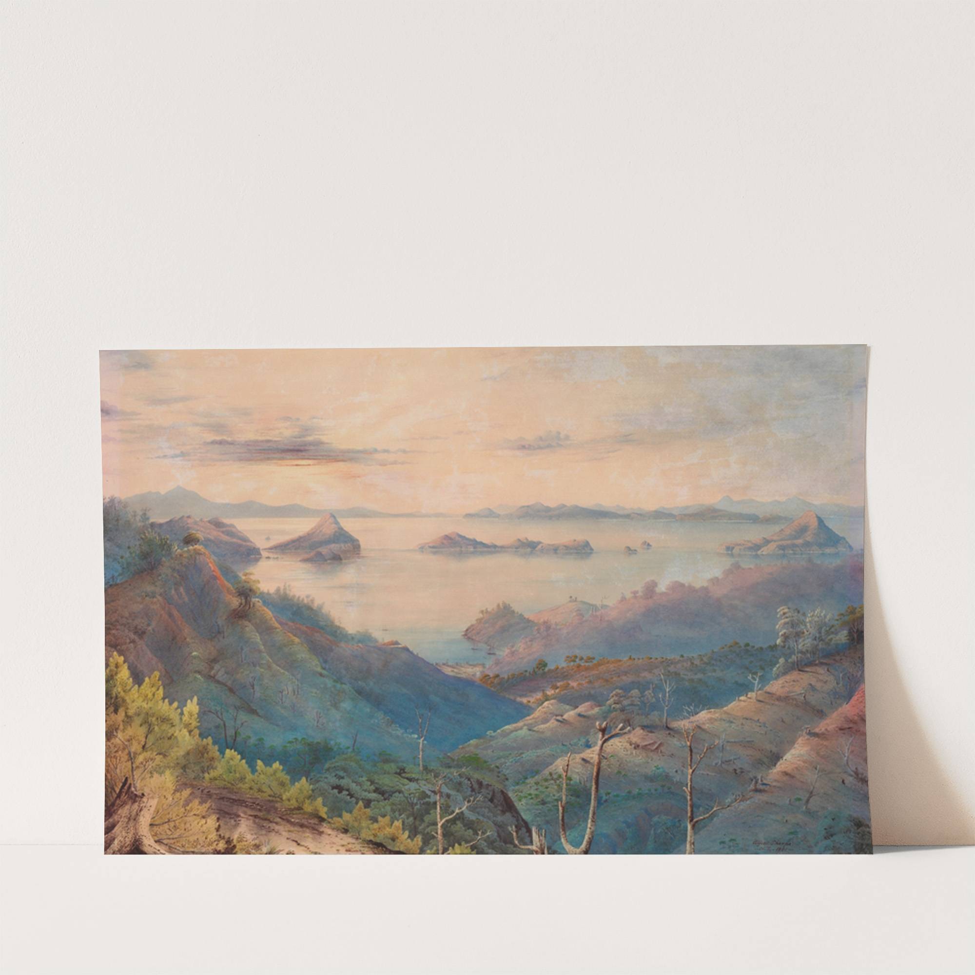 Capture the breathtaking beauty of nature with this stunning art print titled "Sunset on the Kikowhakare Gorges, at Coromandel" by Alfred Sharpe. This painting beautifully depicts a serene landscape bathed in the soft, golden hues of sunset. Rolling hills and...