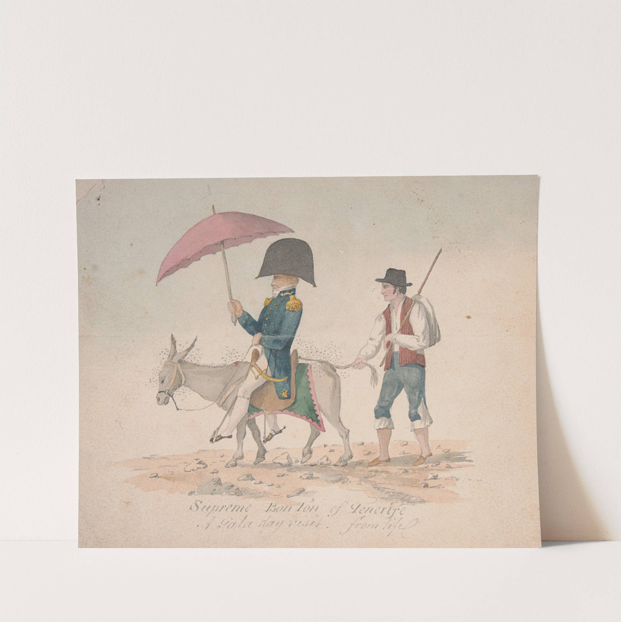 This charming watercolor illustration captures a whimsical moment in history with "Supreme Bon Ton of Teneriffe" by Alfred Diston. The artwork features two historical figures: one dressed as an officer, the other in more rustic attire. The officer, positioned on...