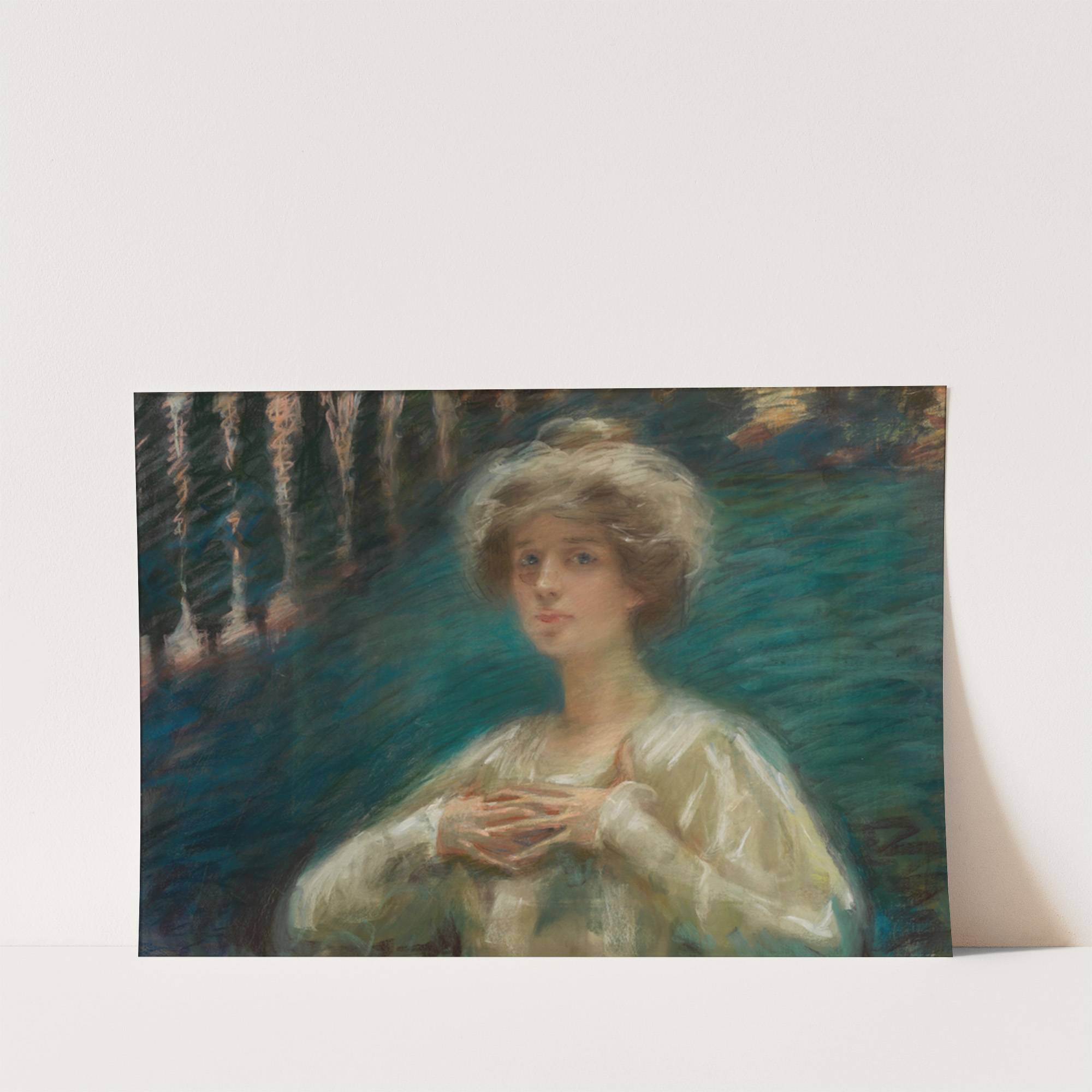 This art print showcases "Sylvan Background" by Alice Pike Barney, capturing a serene and elegant portrait. The subject is a young woman with soft, fair skin and delicate features, gazing gently forward with a calm expression. Her light brown hair...