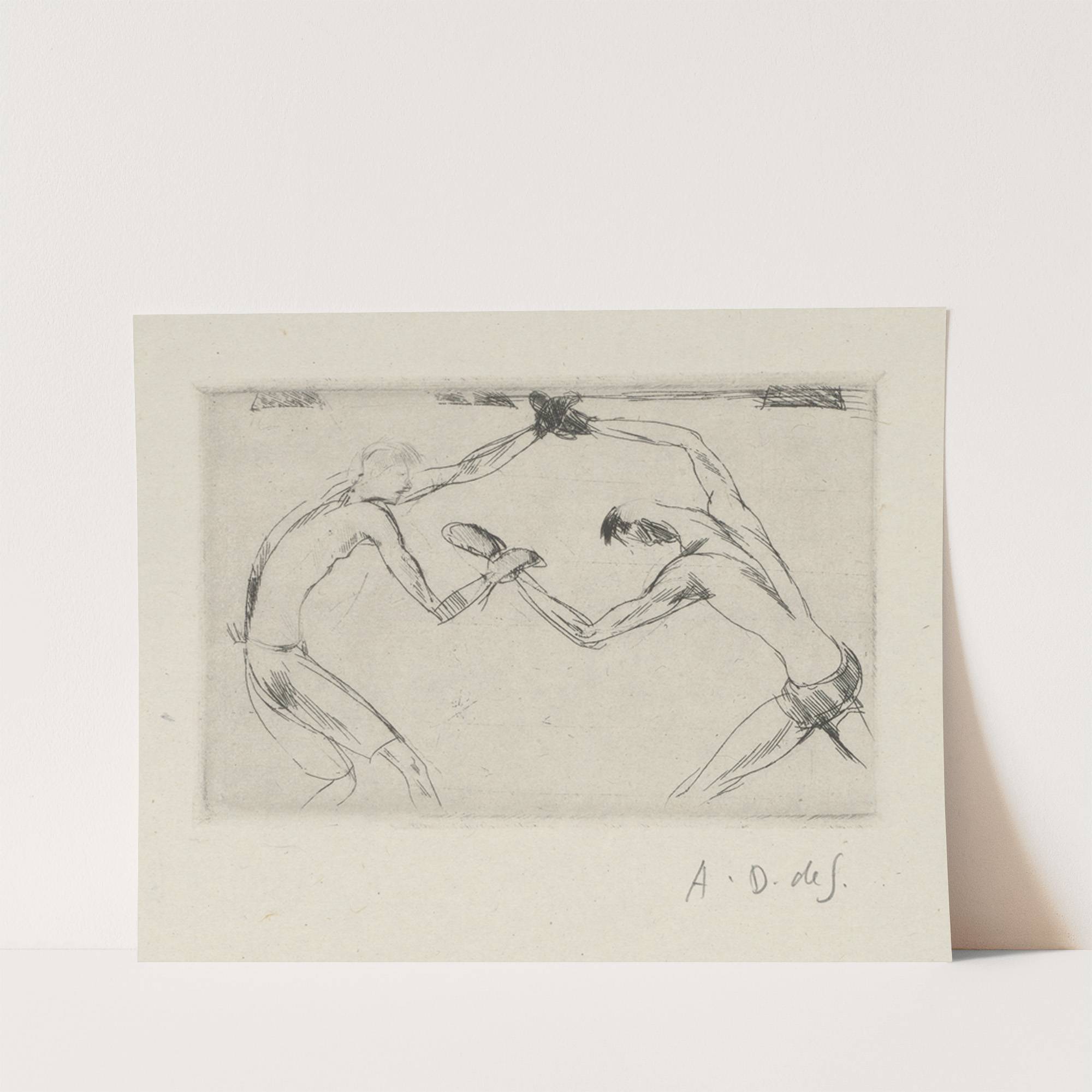 This art print features "Tableau de la boxe" by André Dunoyer de Segonzac. The piece is a delicate pencil sketch, rendered in black and white. It depicts two male boxers in mid-combat, with one boxer on the left and the...