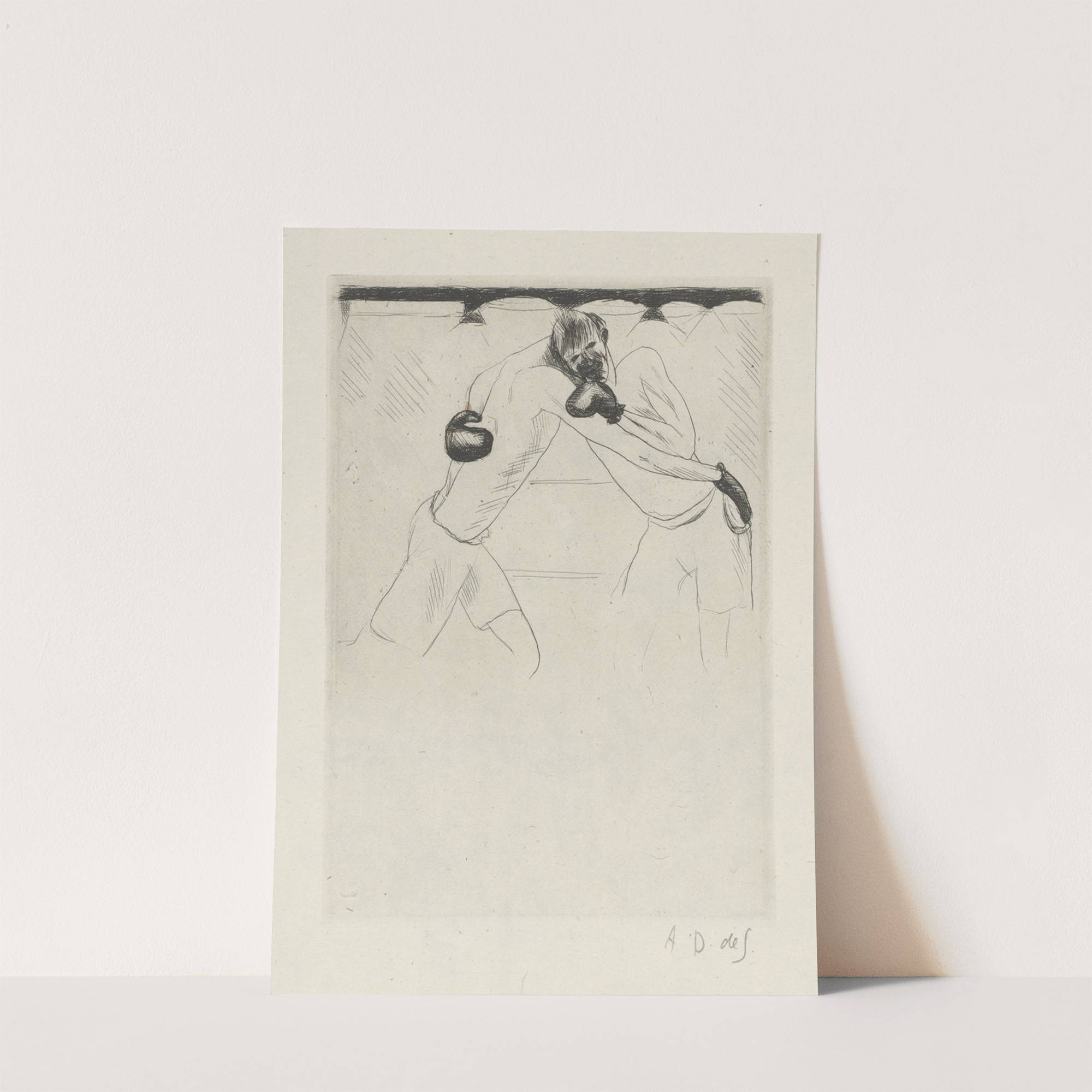 This striking black-and-white etching depicts a boxer caught in mid-punch, exuding raw energy and dynamism. The artist, Andrè Dunoyer de Ségonzac, masterfully uses bold, sweeping lines to capture the motion and intensity of the scene. The boxer's muscular arms are...
