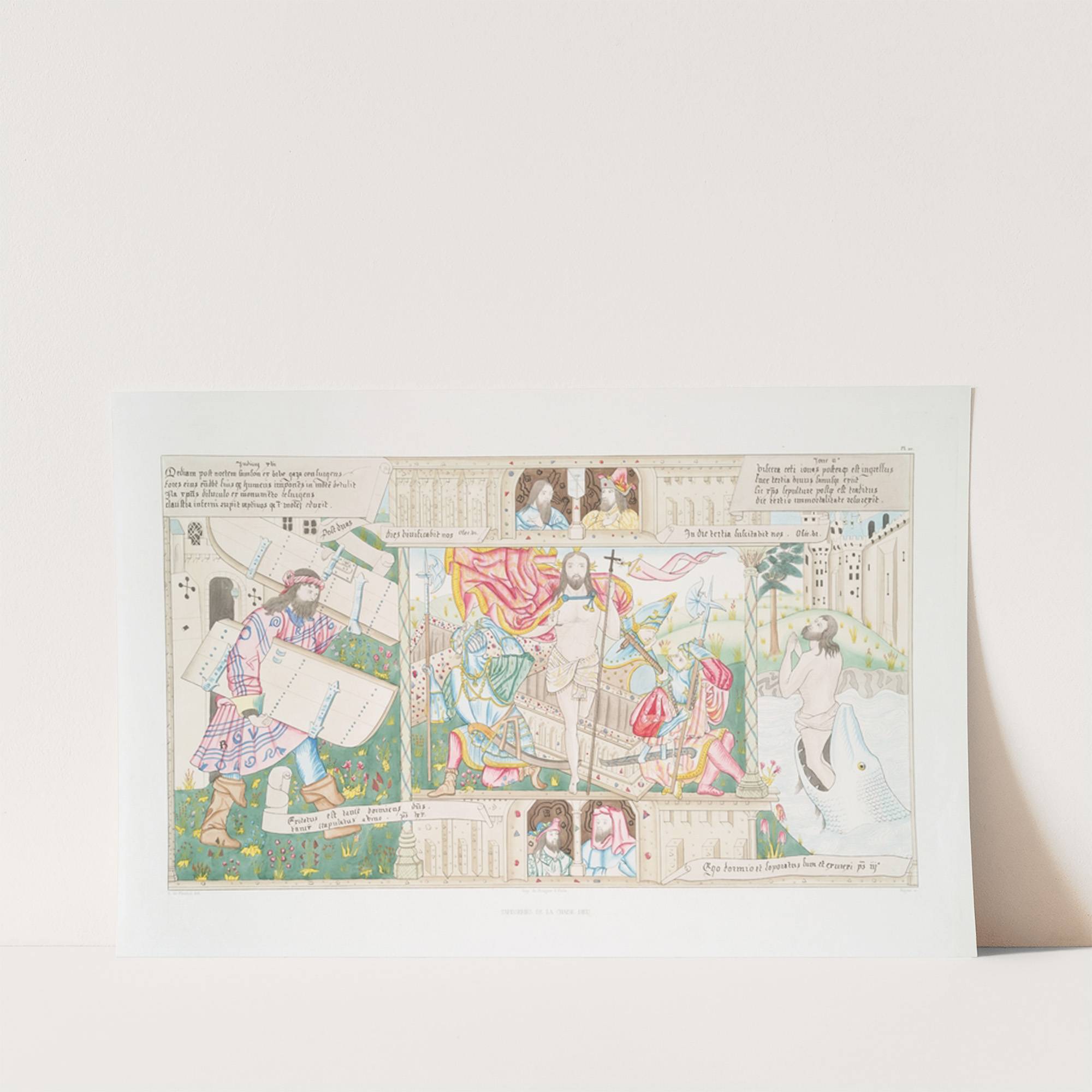 This vibrant art print features "Tapisseries de la Chaise Dieu 20" by the renowned artist Achille Jubinal. The illustration is a colorful, semi-abstract depiction of various figures and scenes that intertwine with each other, creating an engaging mosaic effect. On...
