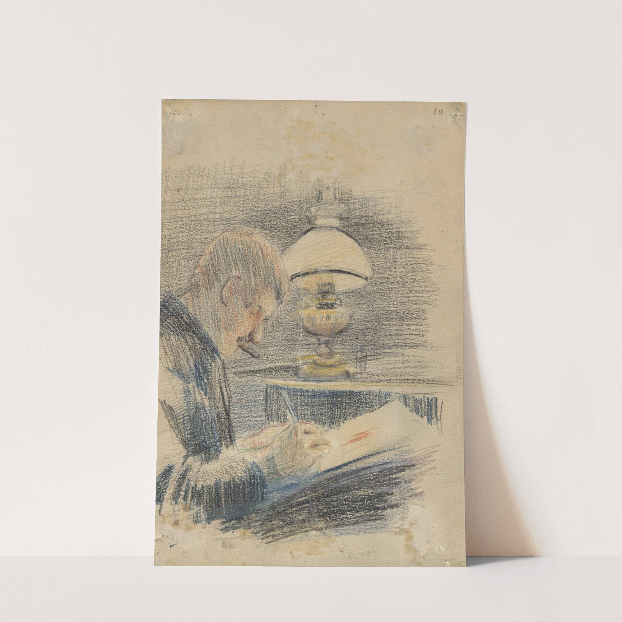 Tegnende mann ved parafinlampe by Karl Dørnberger - Wall Art Print