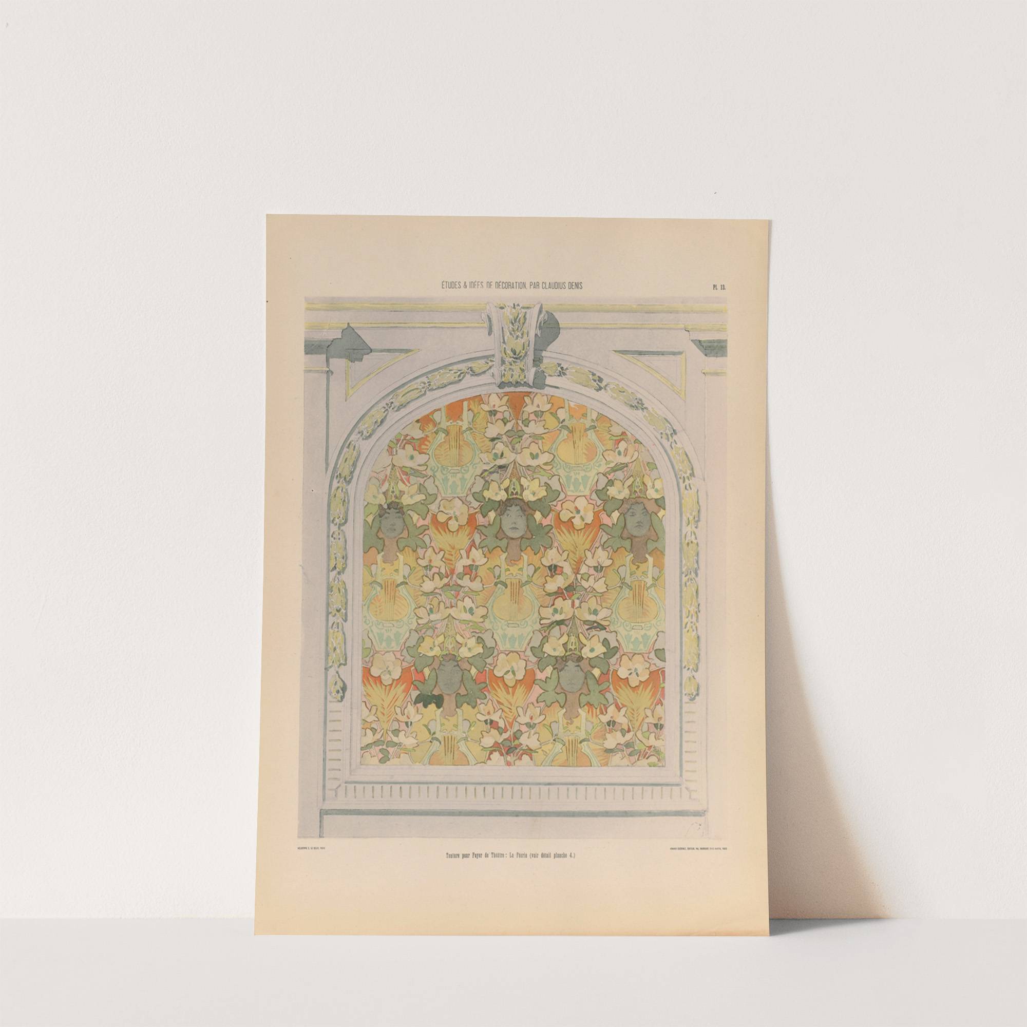 This art print features "Tenture pour Foyer de Théâtre: La Féerie" by Claudius Denis, created in 1920. The piece is a vibrant and detailed illustration depicting a stage set for a theatrical performance. The central focus of the artwork is...