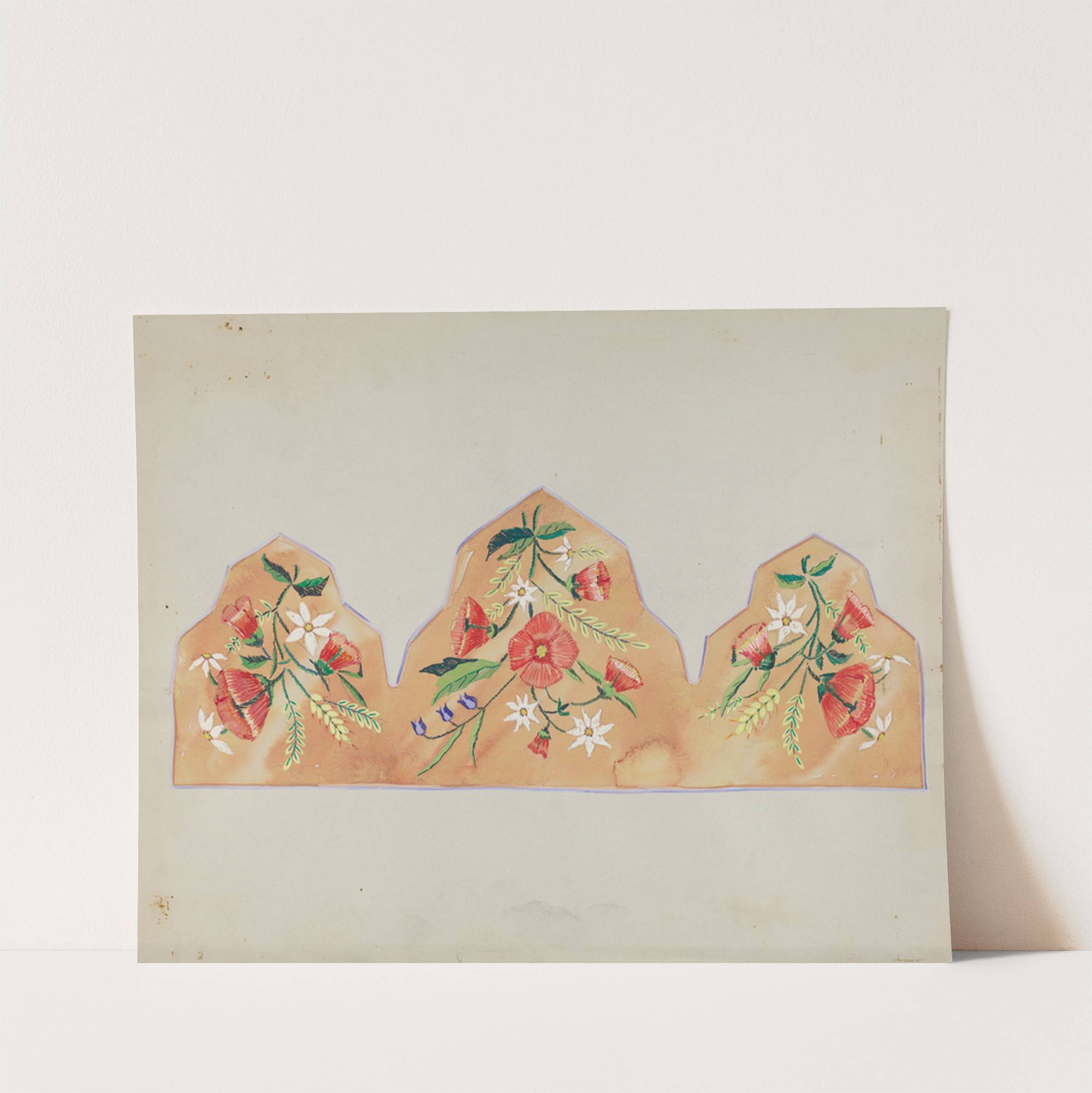 This charming art print features a delicate watercolor illustration of three arch-shaped sections, each adorned with vibrant floral embroidery. The soft peach background gently transitions into the white edges, creating a gentle contrast that highlights the colorful flowers. Each arch...