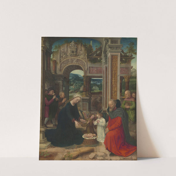 This exquisite art print features "The Adoration of the Shepherds," a masterpiece painted by Adriaen Isenbrandt circa 1520-1540. The scene is richly detailed, depicting Mary and Joseph with their newborn son surrounded by a group of adoring figures in an...