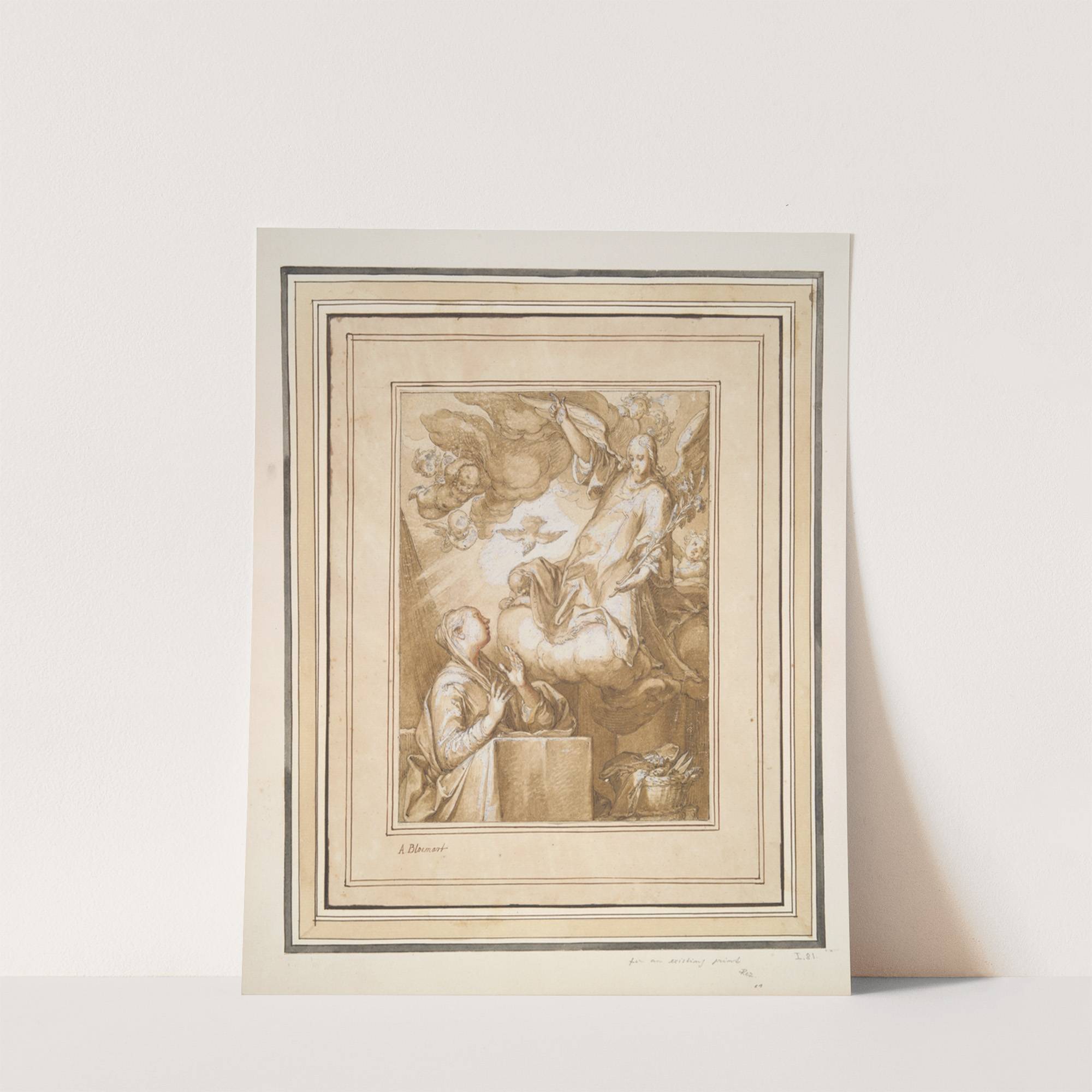 This elegant artwork features "The Annunciation" by Abraham Bloemaert, rendered in delicate sepia tones. This beautifully intricate drawing showcases the moment of divine communication where Gabriel announces to Mary that she will be the mother of Jesus. The central figure...