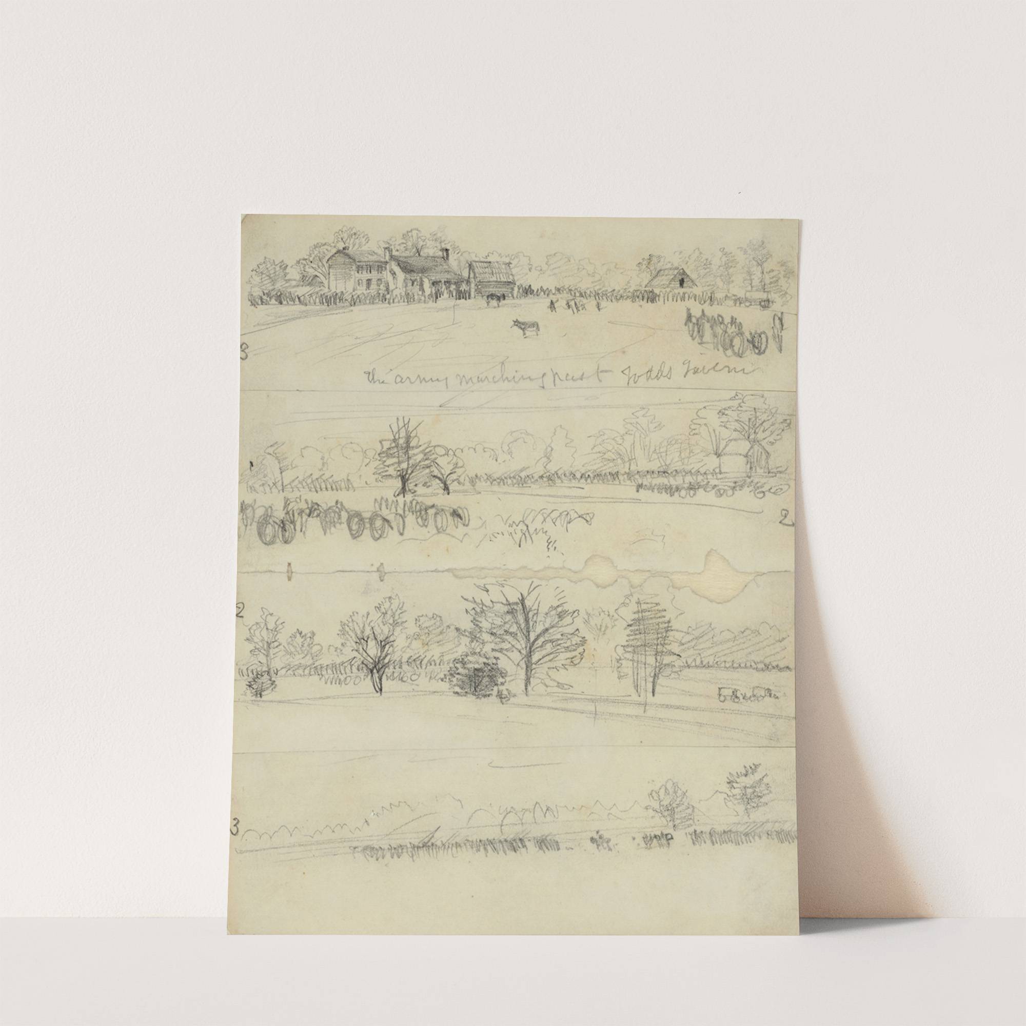 This art print features a series of pencil sketches depicting a picturesque rural landscape in multiple stages, creating a layered effect. Each section captures the serene beauty of a countryside village and surrounding fields with meticulous detail.The topmost layer presents...