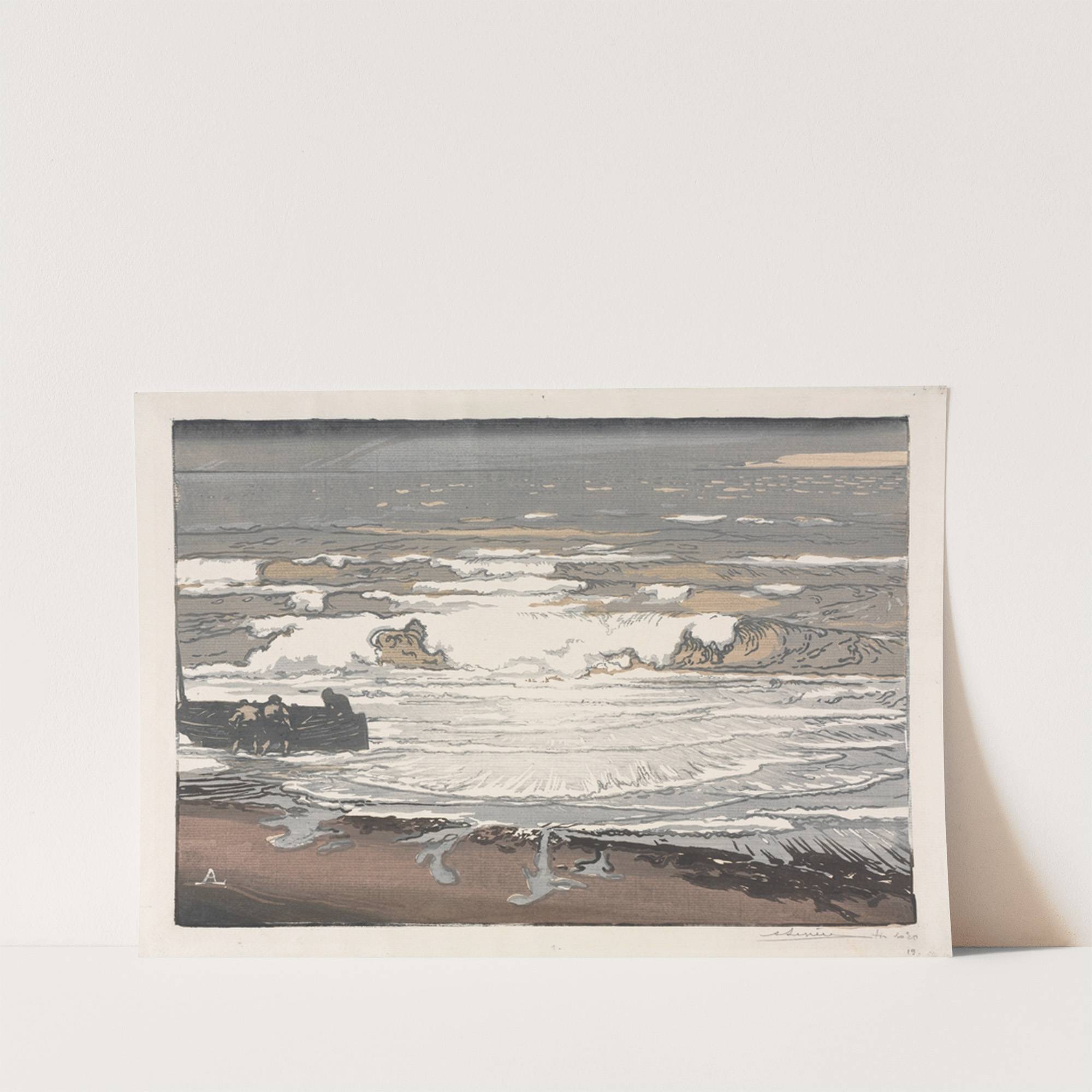 This art print features "The Breaking Waves, Tide of September" by Auguste Louis Lepère, created in 1901. The piece captures a dynamic seascape with a focus on the powerful motion of breaking waves crashing onto the shore. The artist employs...