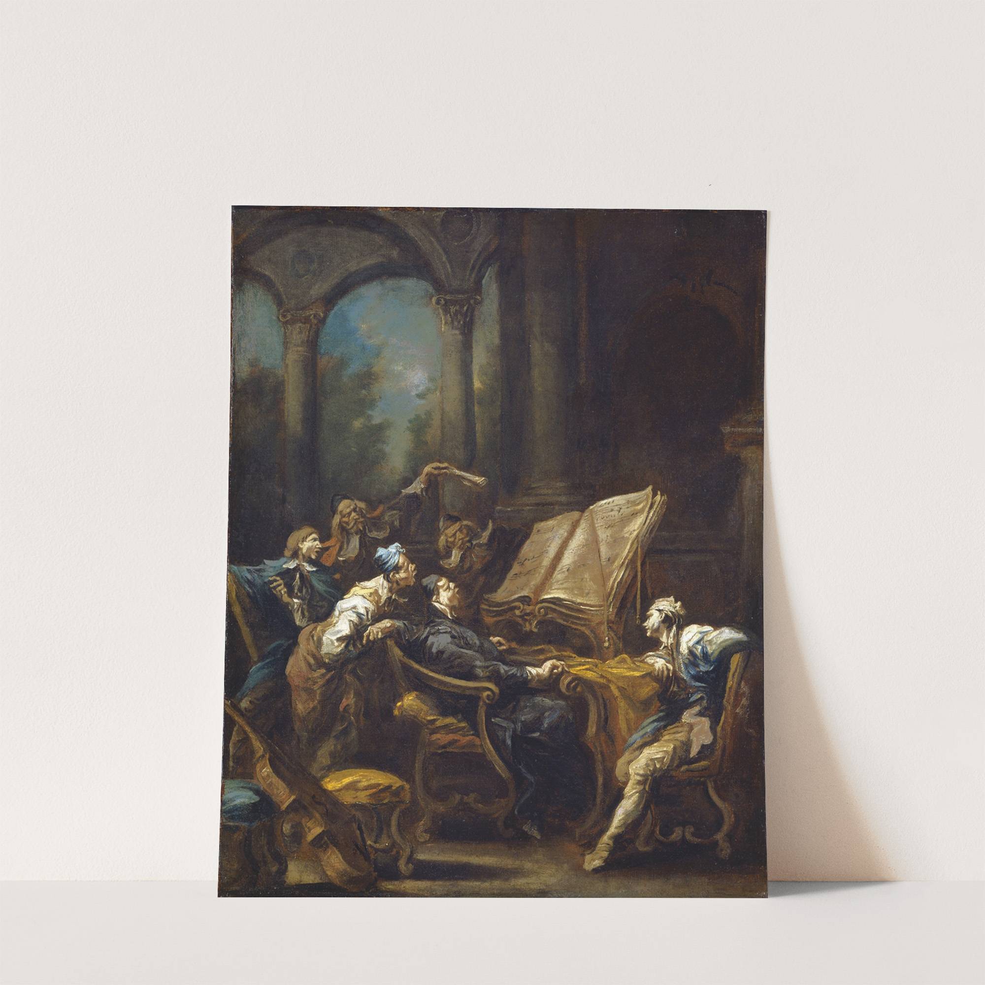 This stunning artwork is "The Choristers" by Alessandro Magnasco, capturing an intense moment of artistic creation in a classical setting. Painted with dramatic chiaroscuro, the scene features five male figures engrossed in their musical practice within a dimly lit, arched...
