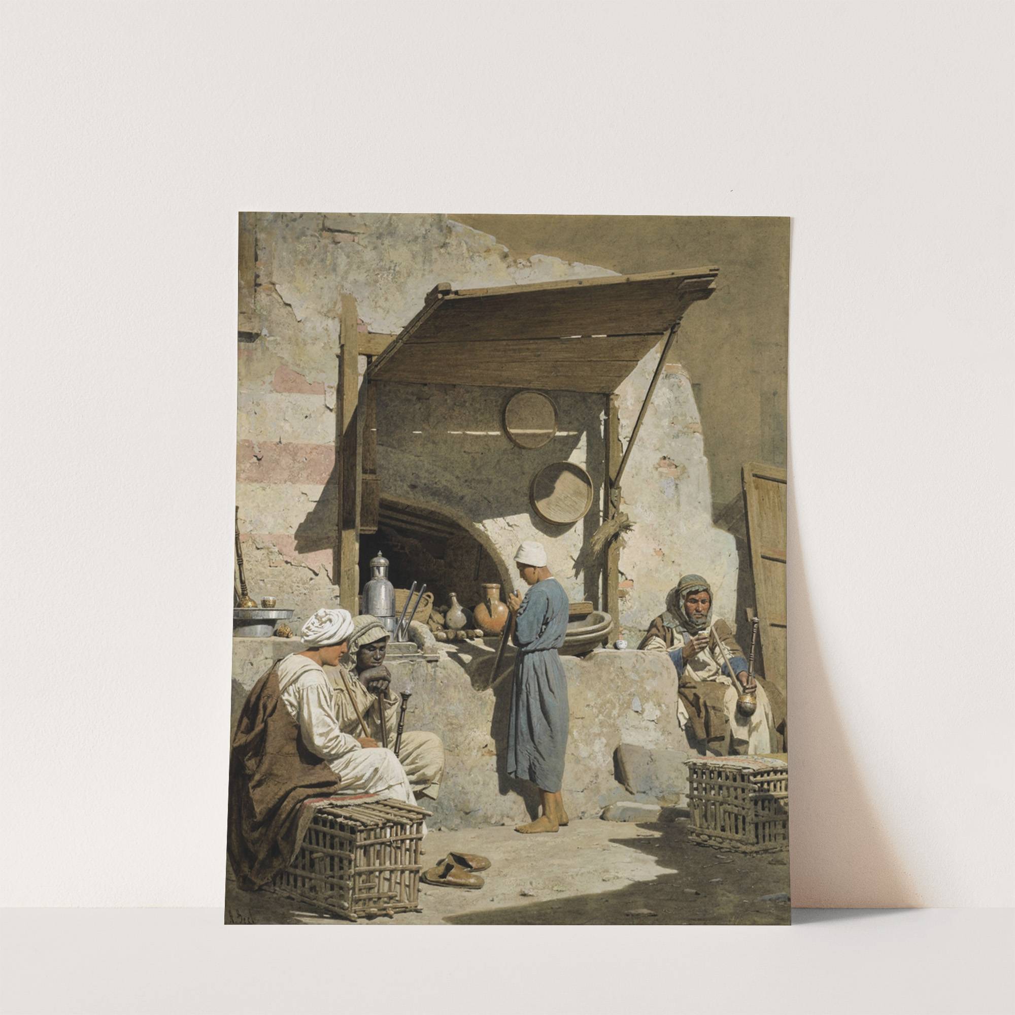 This print features "The Coffee Shop" by Adolf Seel, depicting a warm and rustic Middle Eastern scene. Three people are engaged in daily activities within an old, sunlit coffee shop. In the foreground, a man sits on a low wooden...