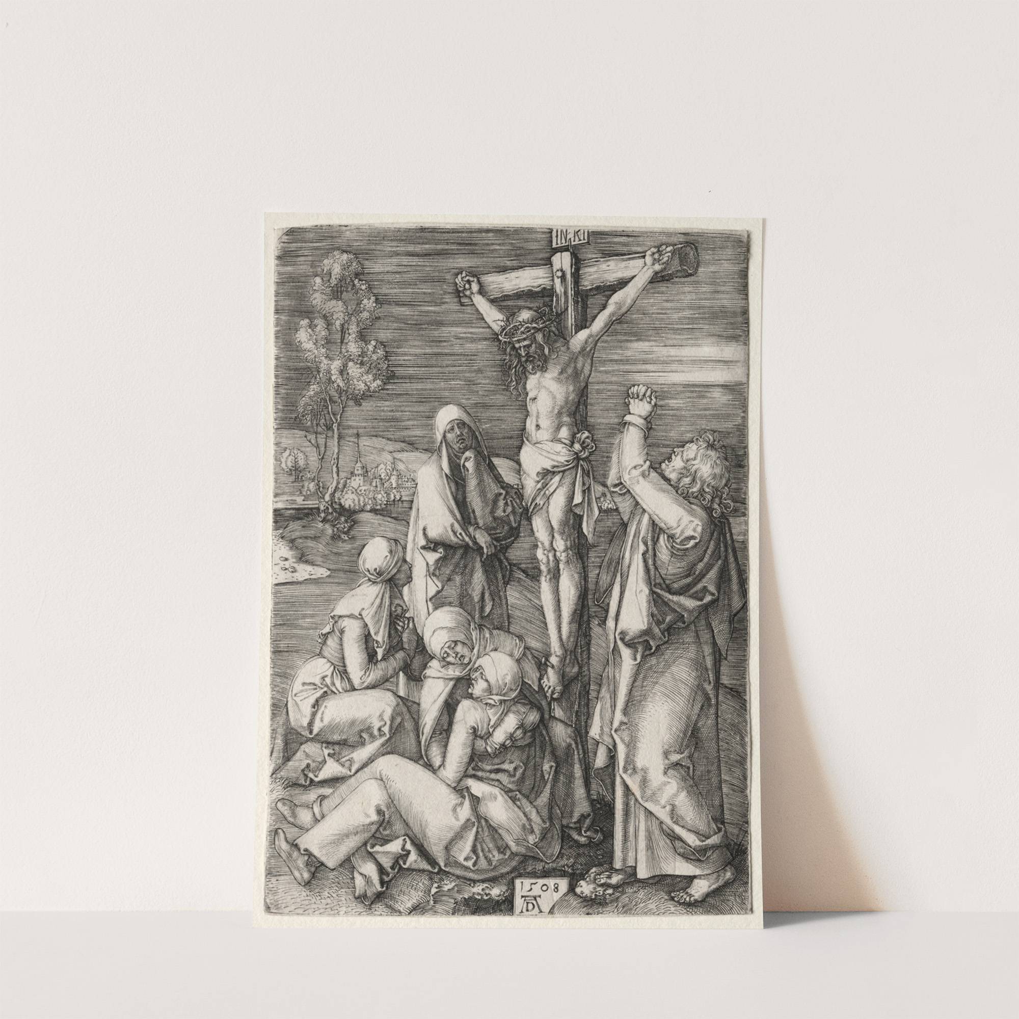 This exquisite black-and-white engraving depicts "The Crucifixion" by Albrecht Dürer, a masterpiece of Renaissance art. At the center, Jesus Christ is crucified on a wooden cross with his head slightly tilted to the side and a crown of thorns weighing...