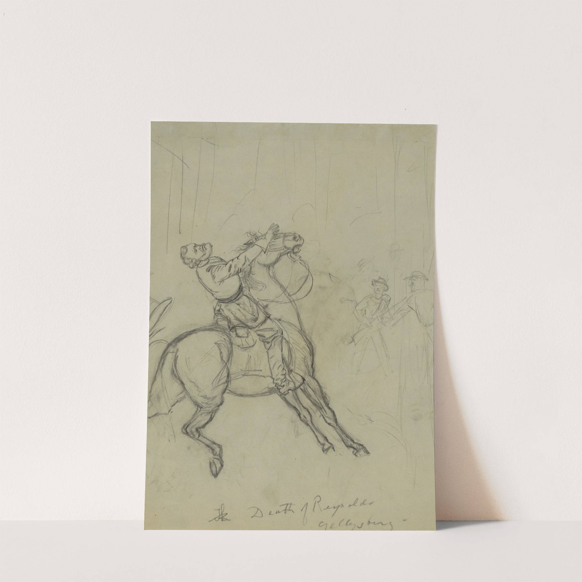 This is an intricately detailed pencil sketch titled "The Death of Reynolds at Gettysburg" by Alfred Rudolph Waud. It captures the intense moment in which a fallen soldier is being aided on his horse, symbolizing the chaos and urgency of...