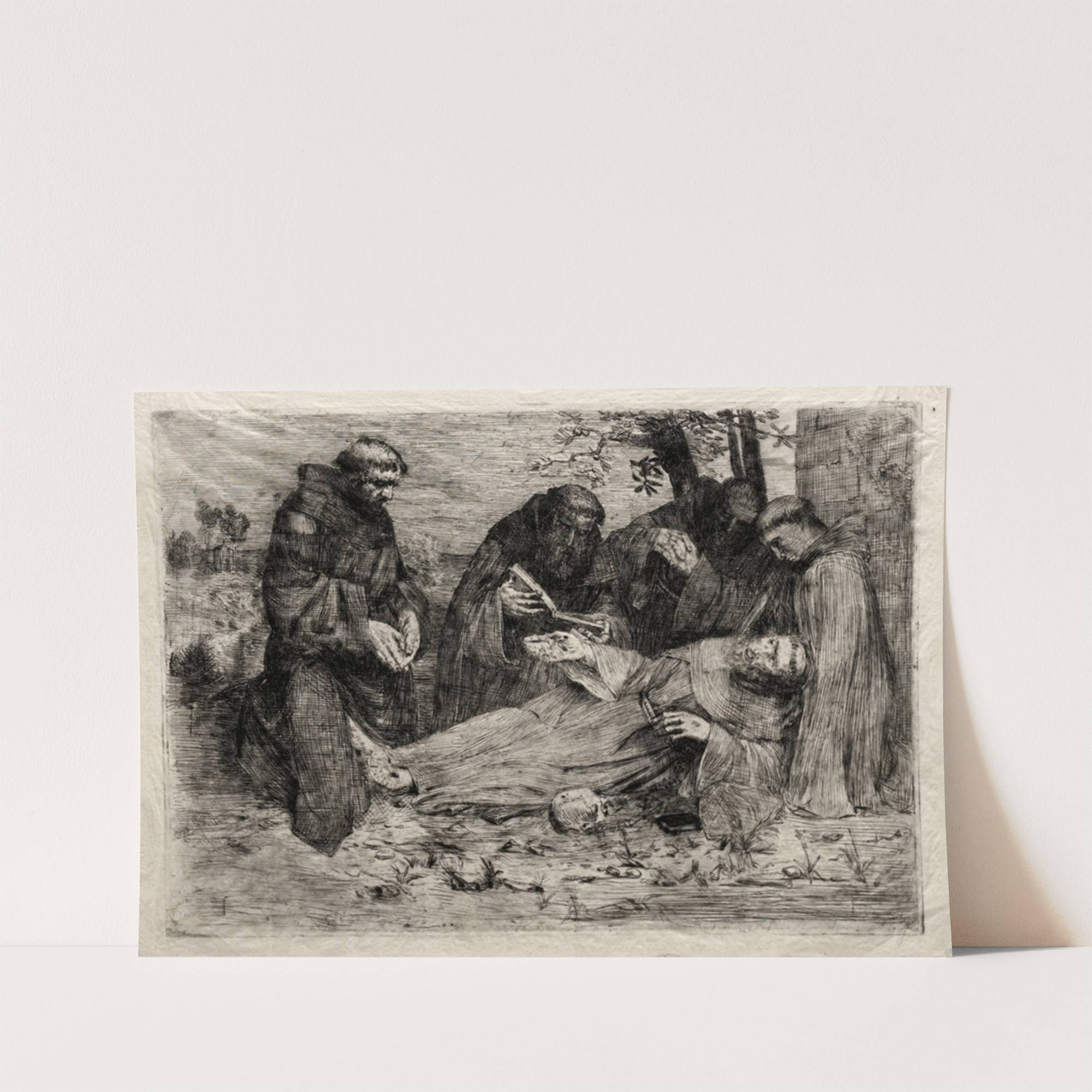 This black and white art print depicts "The Death of St. Francis" by Alphonse Legros. The image is rich in detail, showcasing a somber scene with religious undertones. Central to the composition is a figure lying on the ground, draped...