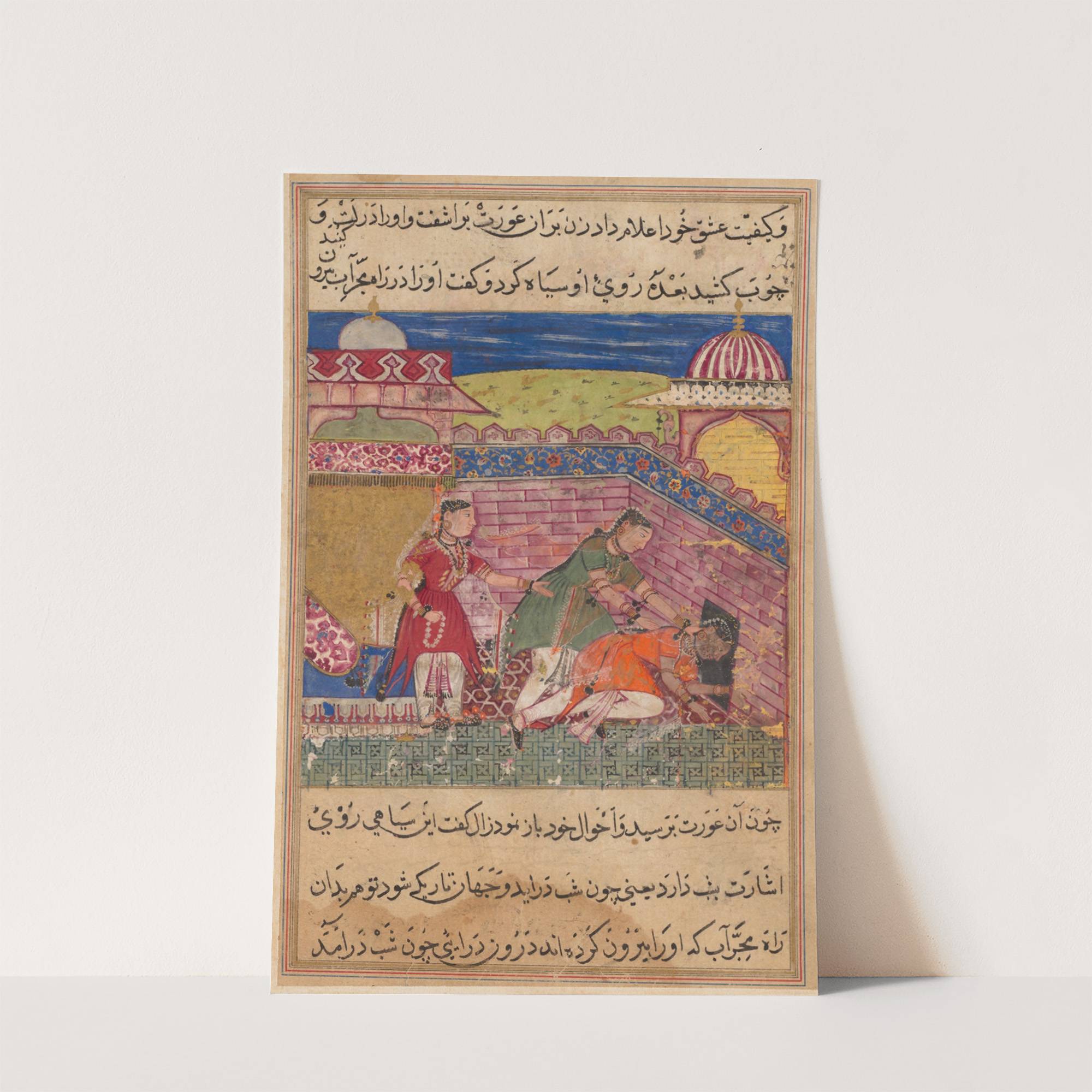 The deceitful wife ejects the procuress after blackening her face, from a Tuti-nama (Tales of a Parrot); Eighth Night (c. 1560) by Shravana - Wall Art Print