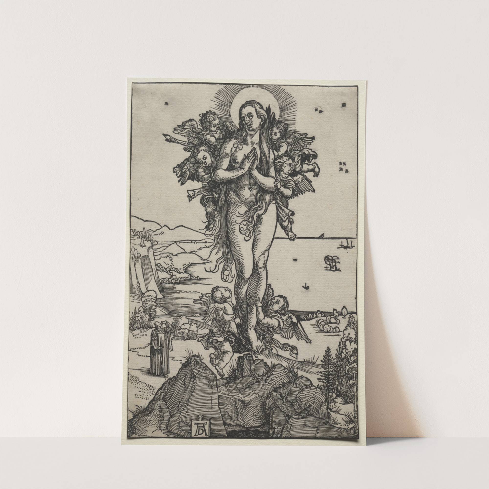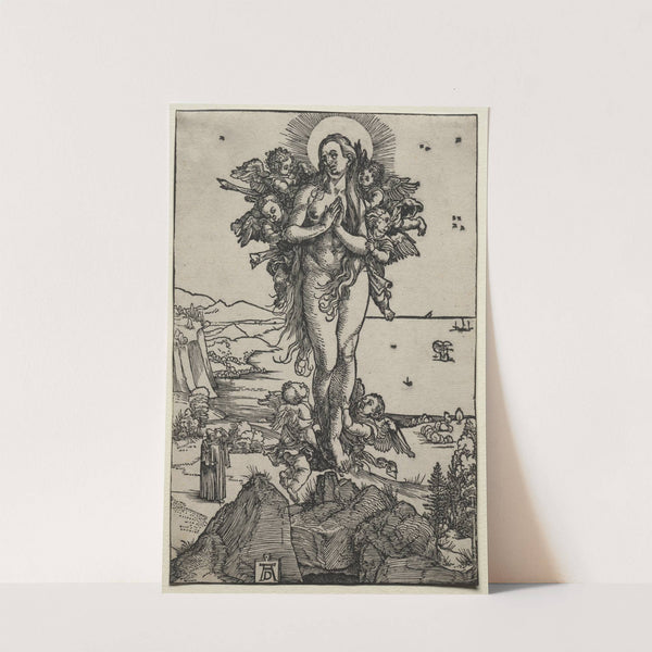 This striking black-and-white art print features "The Ecstasy of Mary Magdalene" by Albrecht Dürer, an iconic masterpiece from the Renaissance period. Centered in the composition is a beautifully detailed depiction of Mary Magdalene, standing on a rocky terrain with her...