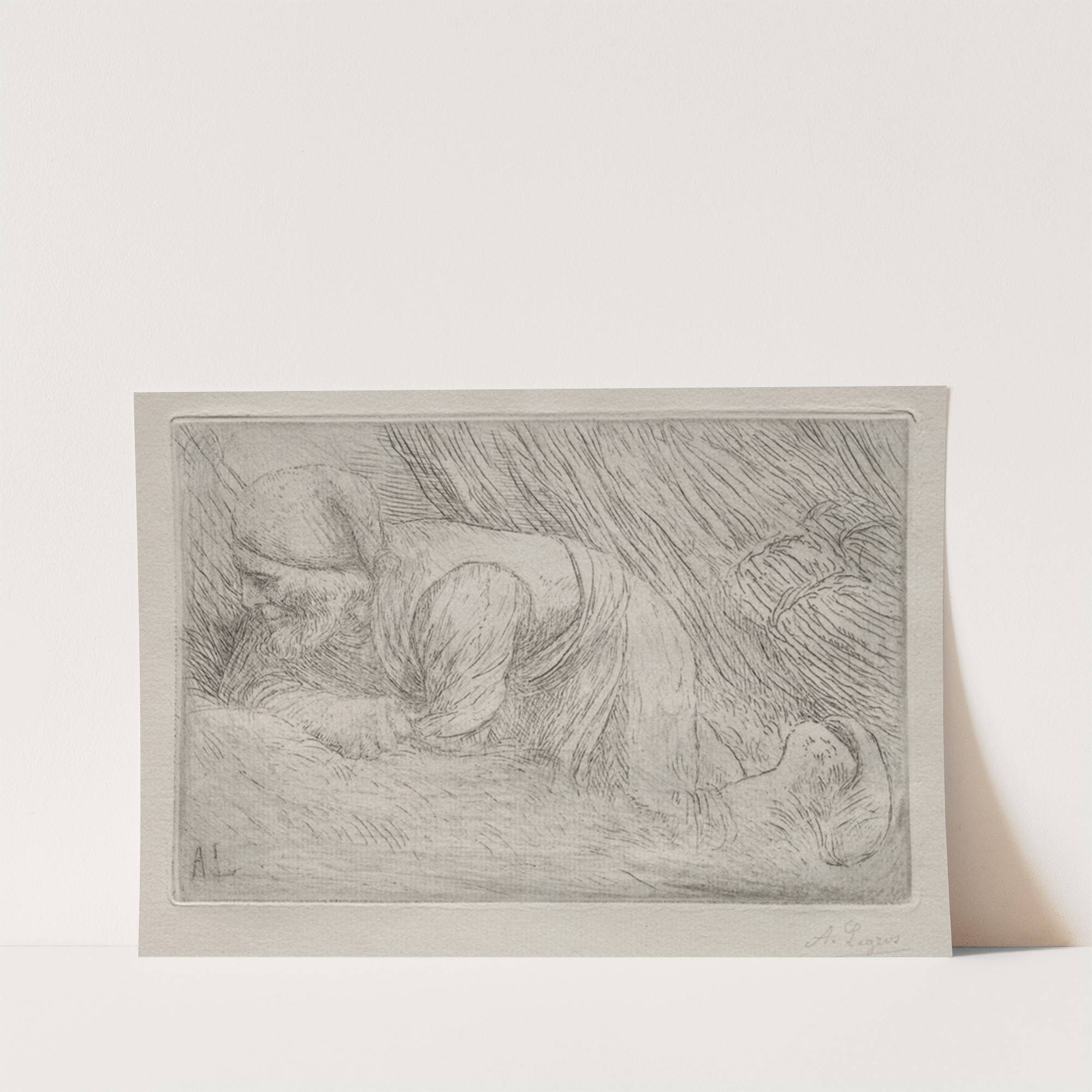 This exquisite art print captures "The Fagot Gatherers" by renowned artist Alphonse Legros. Rendered in delicate pencil sketches, the scene depicts two figures huddled together on the ground, their forms softly illuminated against a textured background of sweeping lines and...