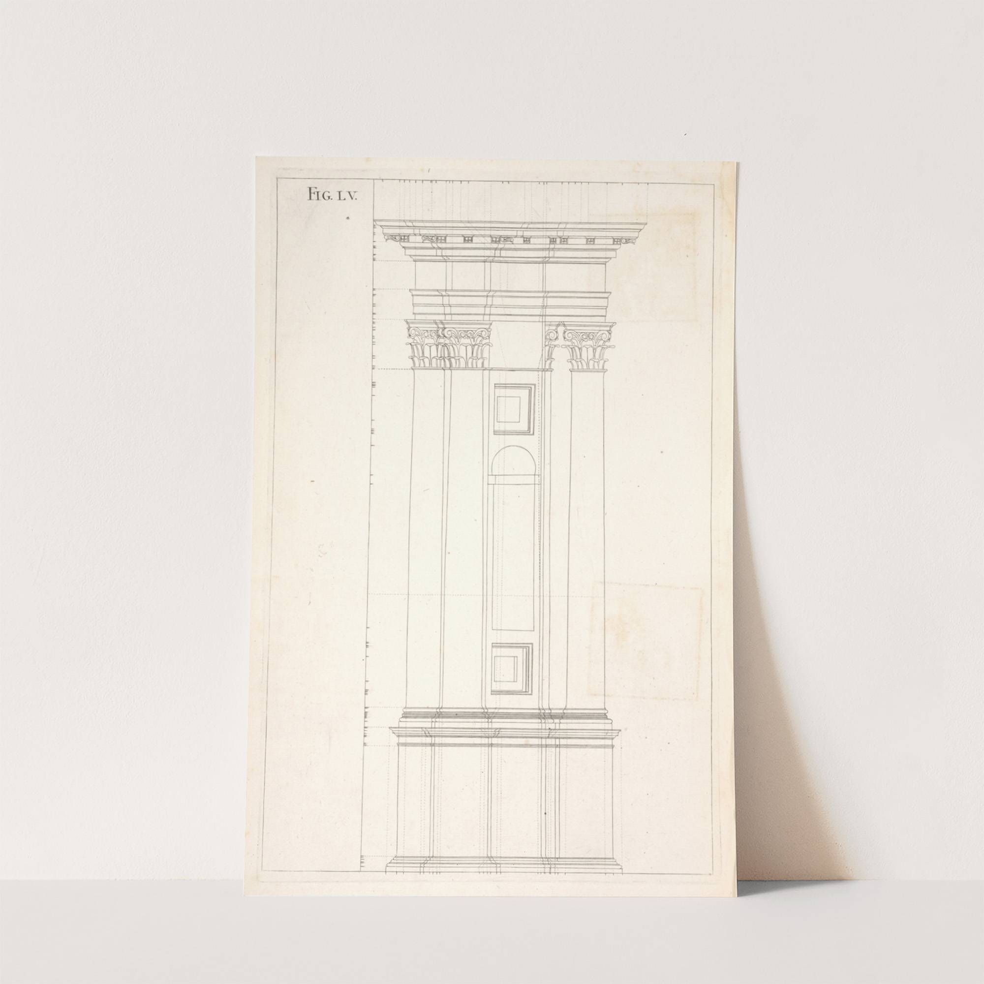 This is an elegant architectural drawing titled "The Geometrical Elevation of a Corinthian Work" by the artist Andrea Pozzo. This detailed line drawing captures the intricate design elements of a classical Corinthian column, showcasing both vertical and horizontal lines that...