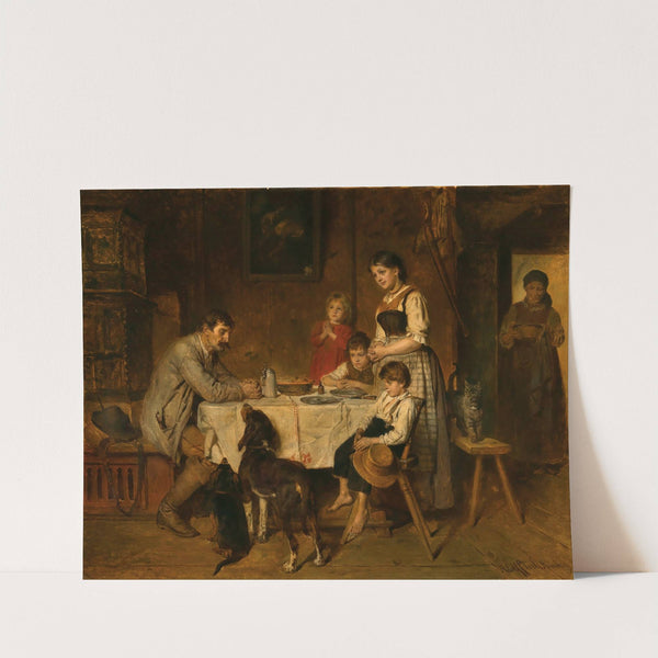 This charming oil painting titled "The Grace" by Adolf Eberle brings to life a warm, rustic family meal scene in a dimly lit room. At the center of the composition, a father with a contemplative expression sits at the head...