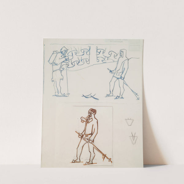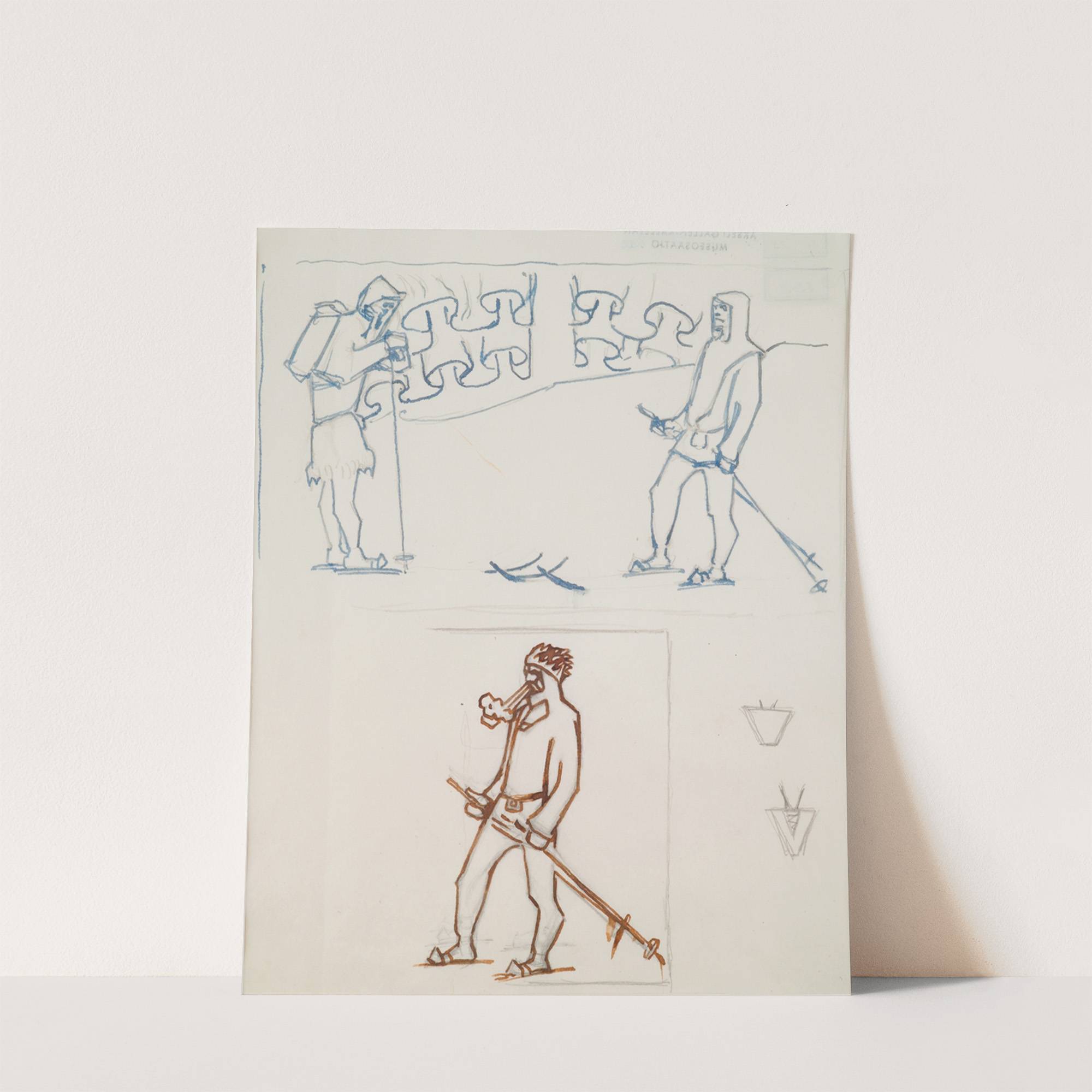 This unique art print features two distinct sketches of skiers set against contrasting backgrounds. The upper section displays a blue line drawing with intricate detailing, capturing two skiers in mid-motion. One skier is positioned on the left, raising their right...