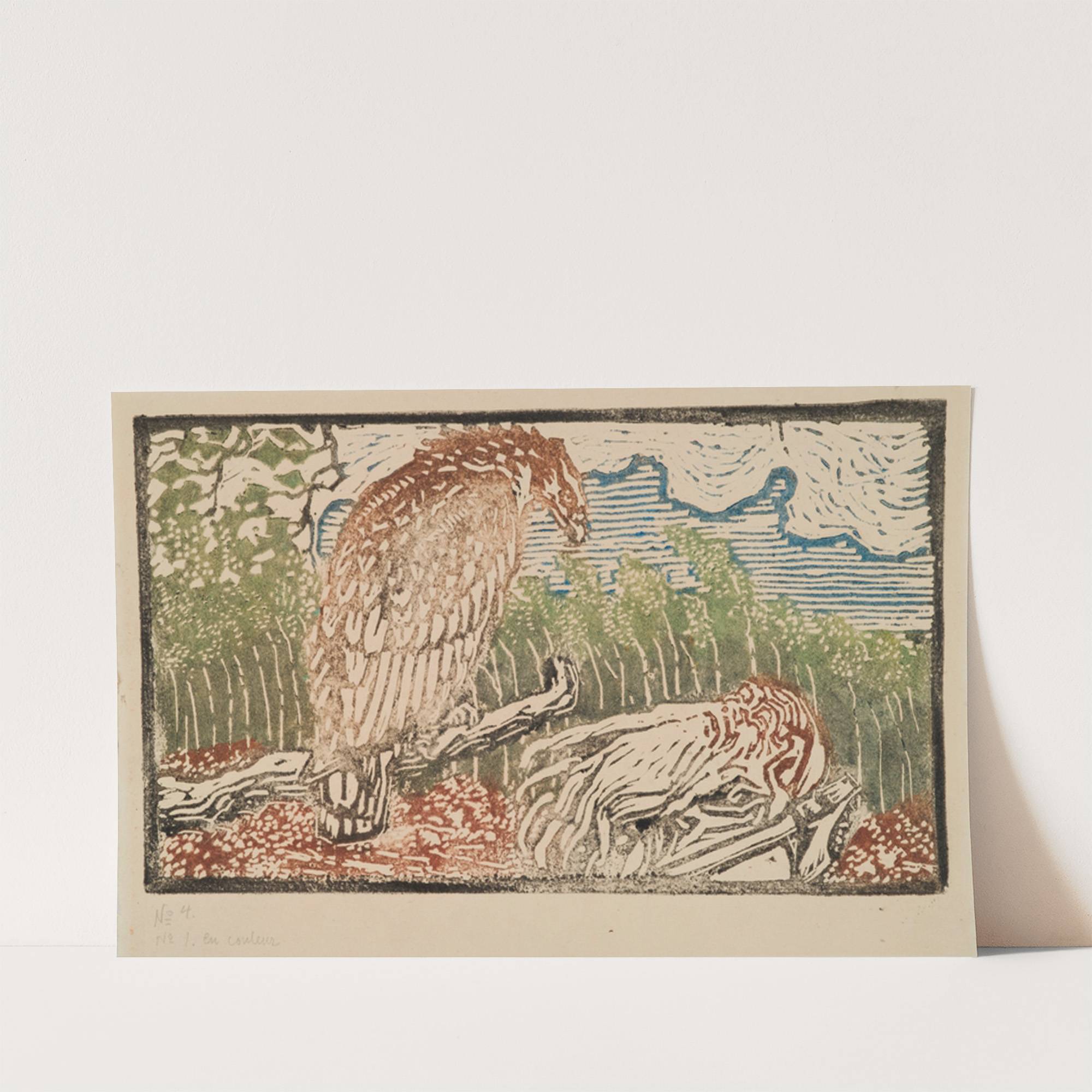 This captivating art print features "The Great Kalevala" by renowned artist Akseli Gall?n-Kallela, showcasing his unique linocut technique. This striking piece depicts a majestic owl perched on a weathered branch, surIn the foreground, a white tiger lies on the ground,...