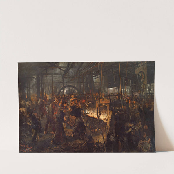 Discover the raw power and industrious spirit of Victorian-era manufacturing with "The Iron Rolling Mill (Modern Cyclopes)" by Adolph von Menzel. This striking digital illustration captures a bustling iron mill scene, ablaze with fiery intensity. The foreground is dominated by...