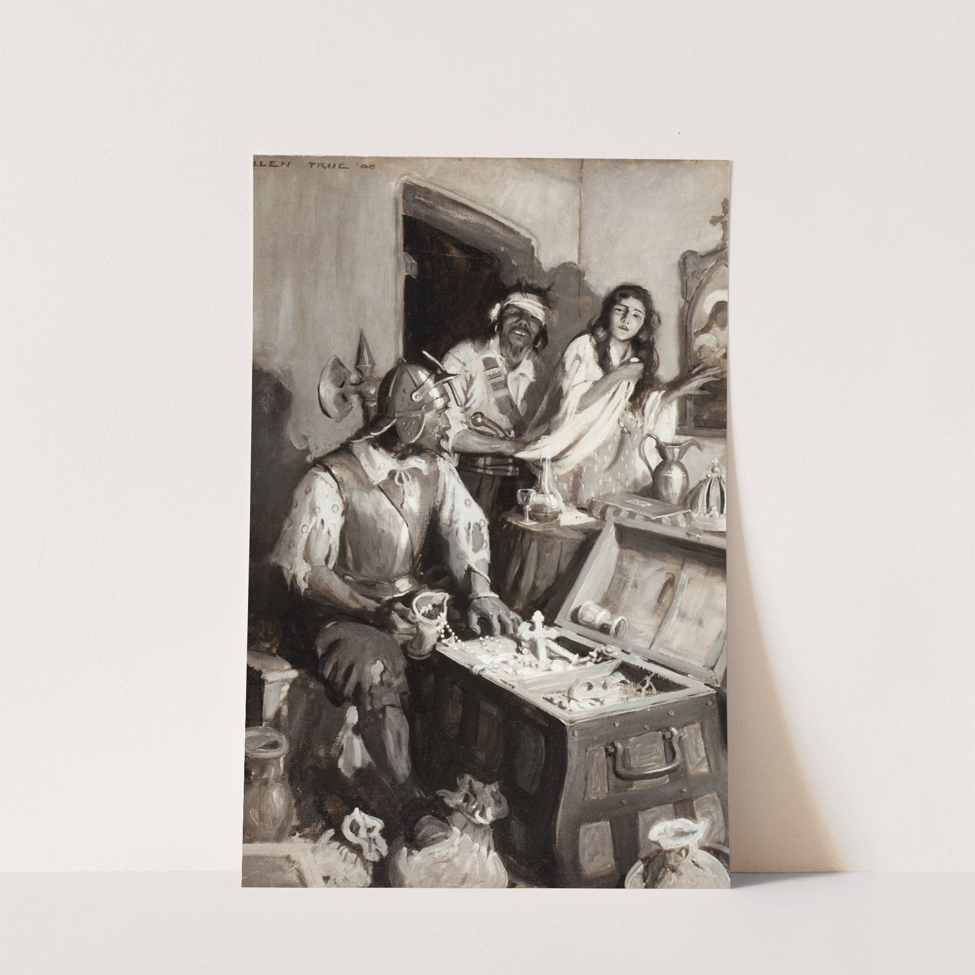 This monochromatic, sepia-toned painting titled "The Jewel Chest" by Allen Tupper True exudes a sense of nostalgia and meticulous craftsmanship. It depicts an intimate scene set in a dimly lit, rustic room where three figures are engaged in the delicate...