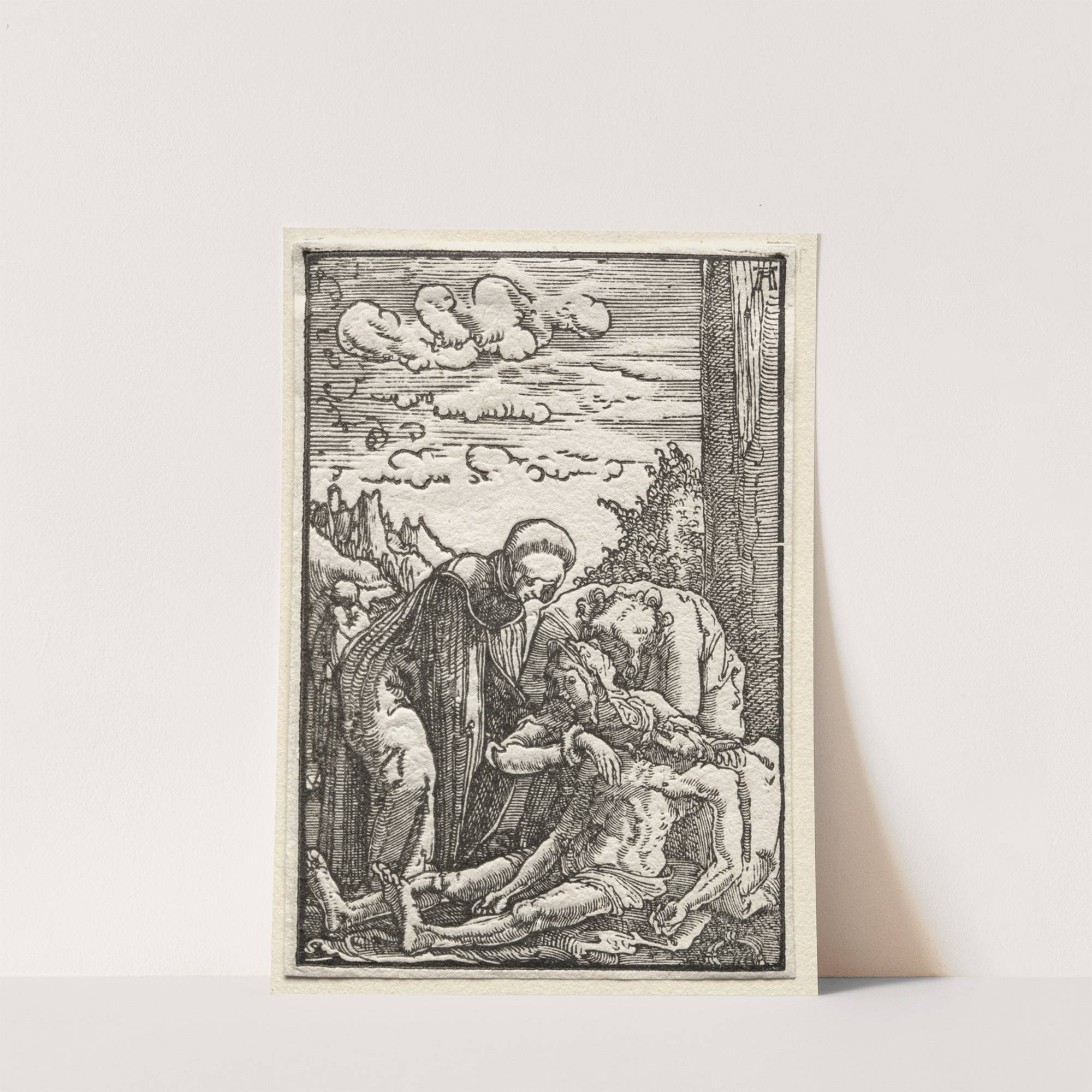 This black-and-white art print showcases "The Lamentation beneath the Cross" by Albrecht Altdorfer, created circa 1515. This intricate piece is etched with fine details, capturing a powerful Christian scene. The central figure is a sorrowful man, depicted in a bent...