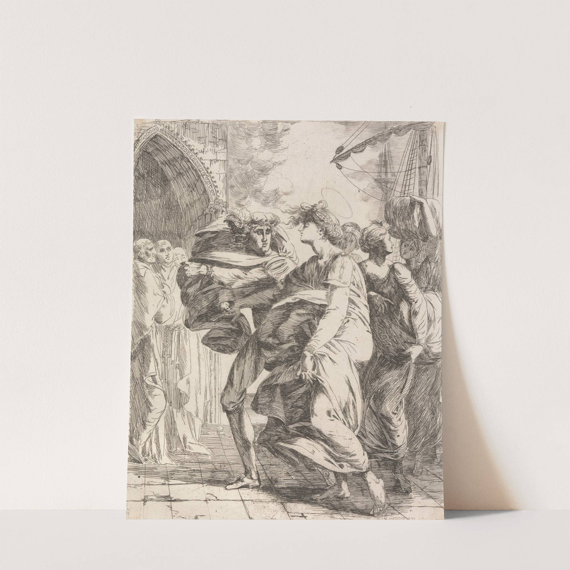 This black-and-white etching captures "The Landing of St. Margaret in Scotland" by Alexander Runciman. It features a dramatic scene with multiple figures engaging in lively motion, creating a sense of dynamic movement and storytelling. At the center, a cloaked figure...