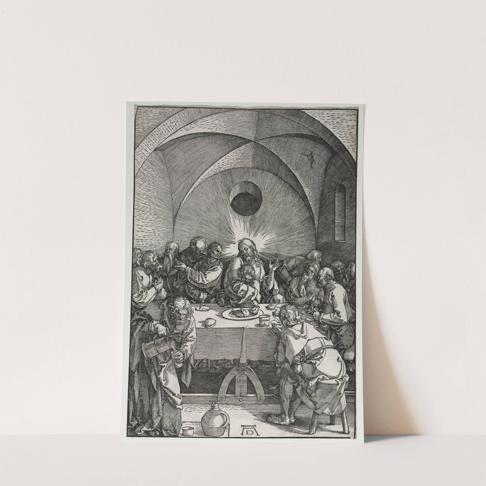 This black-and-white art print features "The Last Supper" by Albrecht Dürer, rendered in meticulous detail with fine lines and cross-hatching techniques. At the center of the composition, Jesus is depicted with a radiant halo, seated at a long table surrounded...