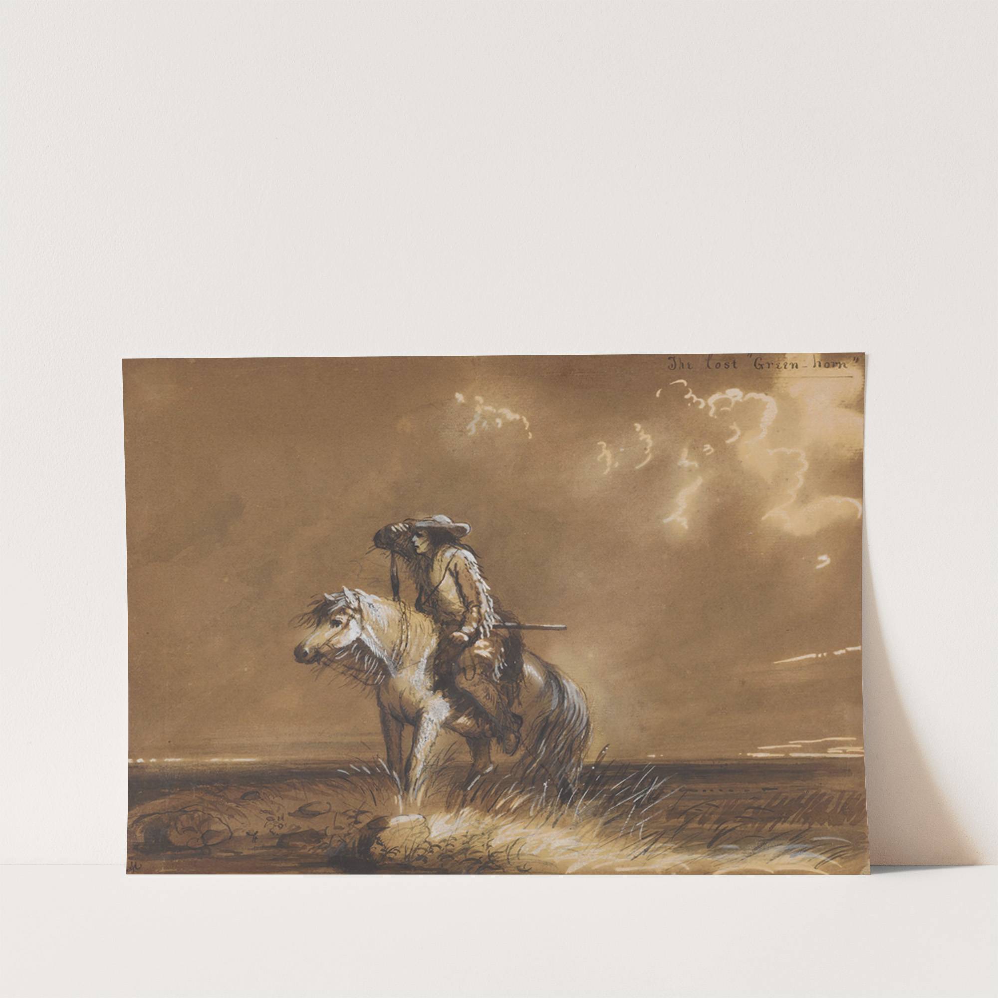This artwork titled "The Lost 'Green-horn'" by Alfred Jacob Miller features a captivating sepia-toned depiction of a lone cowboy atop a horse in a vast, open landscape. The cowboy, dressed in traditional western attire including a hat and rugged clothing,...
