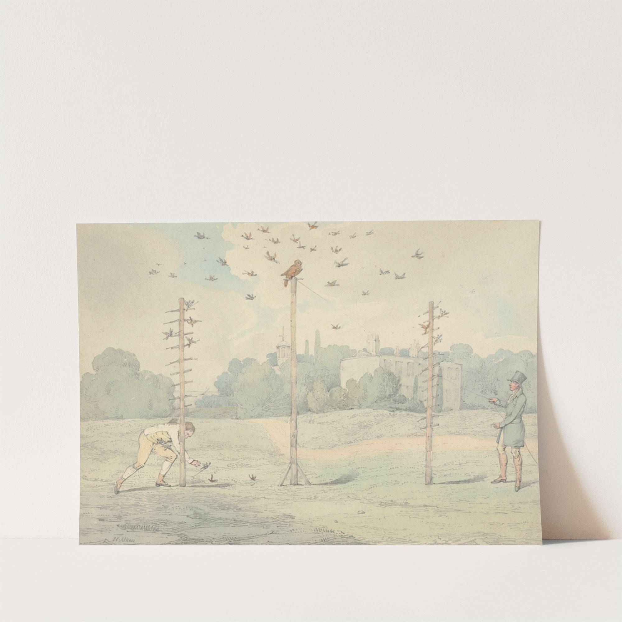 This charming vintage-style print features 'The National Sports of Great Britain,' an illustration by Henry Thomas Alken from 1821. The scene depicts a traditional English cricket match with two players. On the left, a player in light beige attire is...