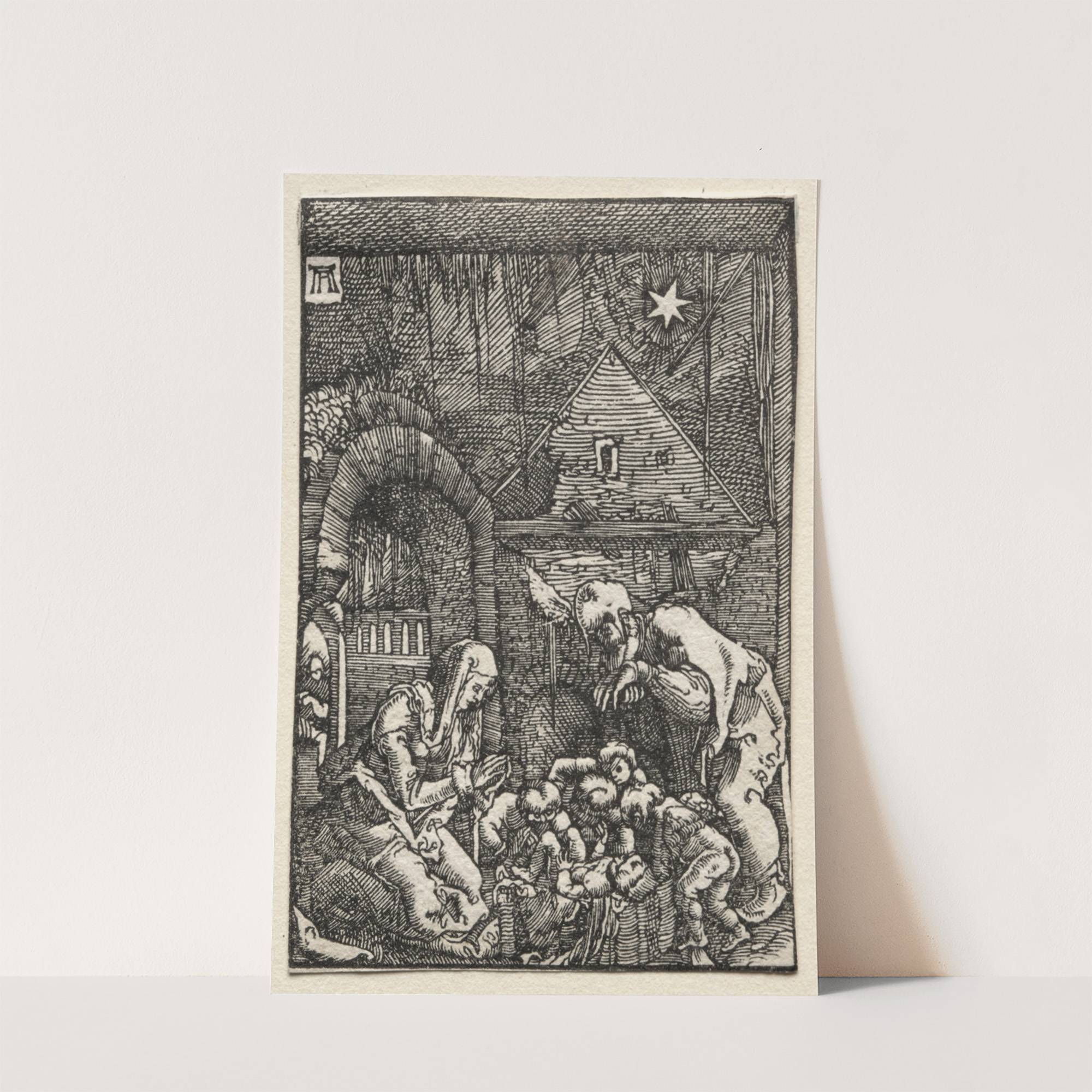 This artwork is a striking black-and-white etching titled "The Nativity" by Albrecht Altdorfer, created circa 1515. It vividly captures the biblical scene of Mary and Joseph presenting baby Jesus in a humble stable seIn the foreground, Mary gently cradles baby...