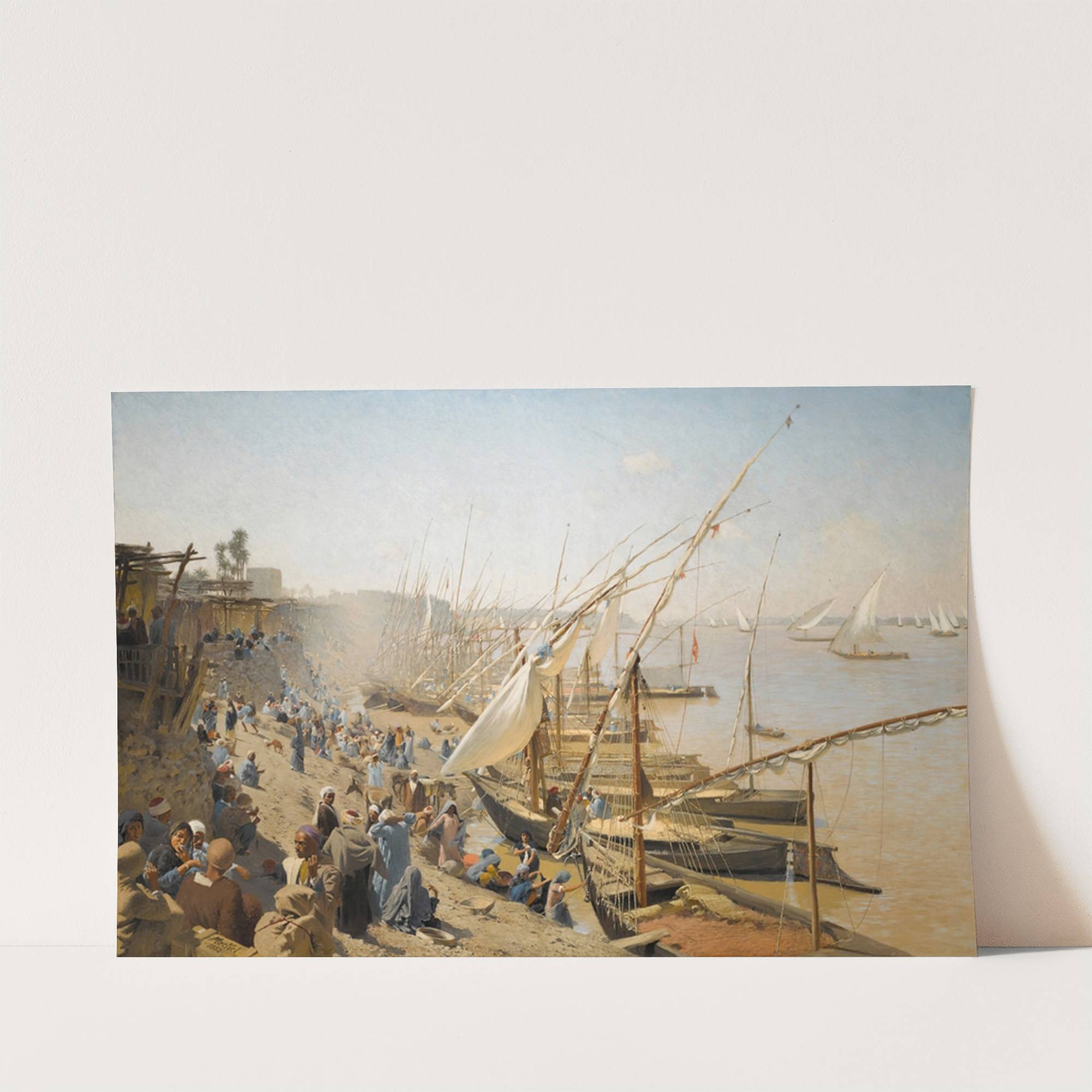 This art print showcases "The Nile at Bulak" by Adolf von Meckel, capturing a lively riverside scene bathed in warm sunlight. The composition is rich with detail, featuring numerous traditional wooden fishing boats with tall masts and white sails anchored...