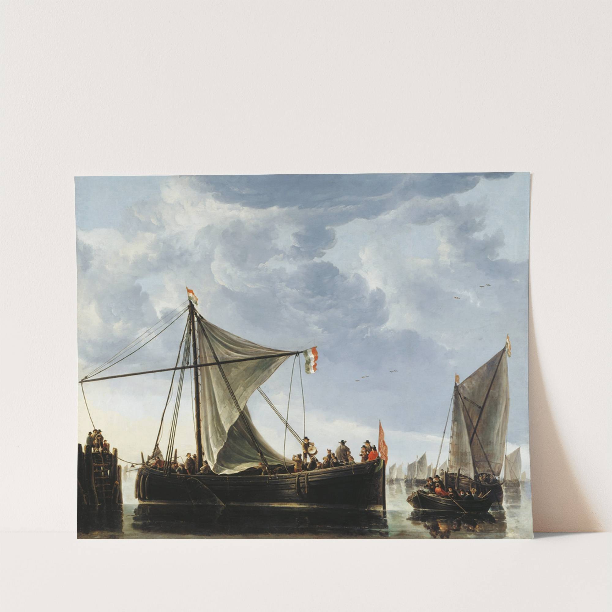 This vibrant art print captures "The Passage Boat" by Albert Cuyp in stunning detail, showcasing the dynamic scene of a coastal waterscape filled with life and activity. The left side features an impressively large boat with a tall, billowing sail,...
