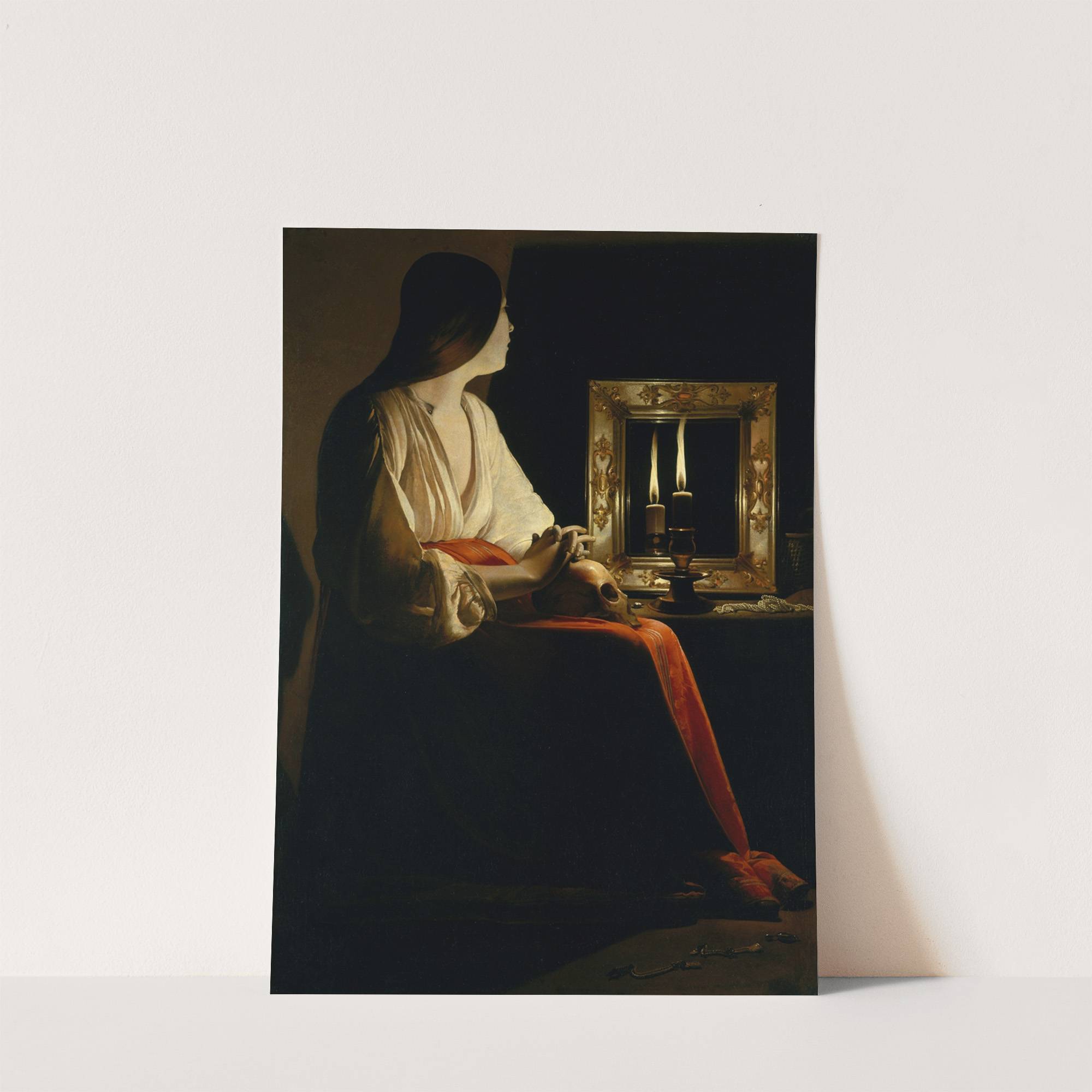 This striking art print features "The Penitent Magdalen" by Georges de La Tour, renowned for his mastery of chiaroscuro, the dramatic play of light and shadow. The scene showcases a young woman with long dark hair, illuminated softly from the...