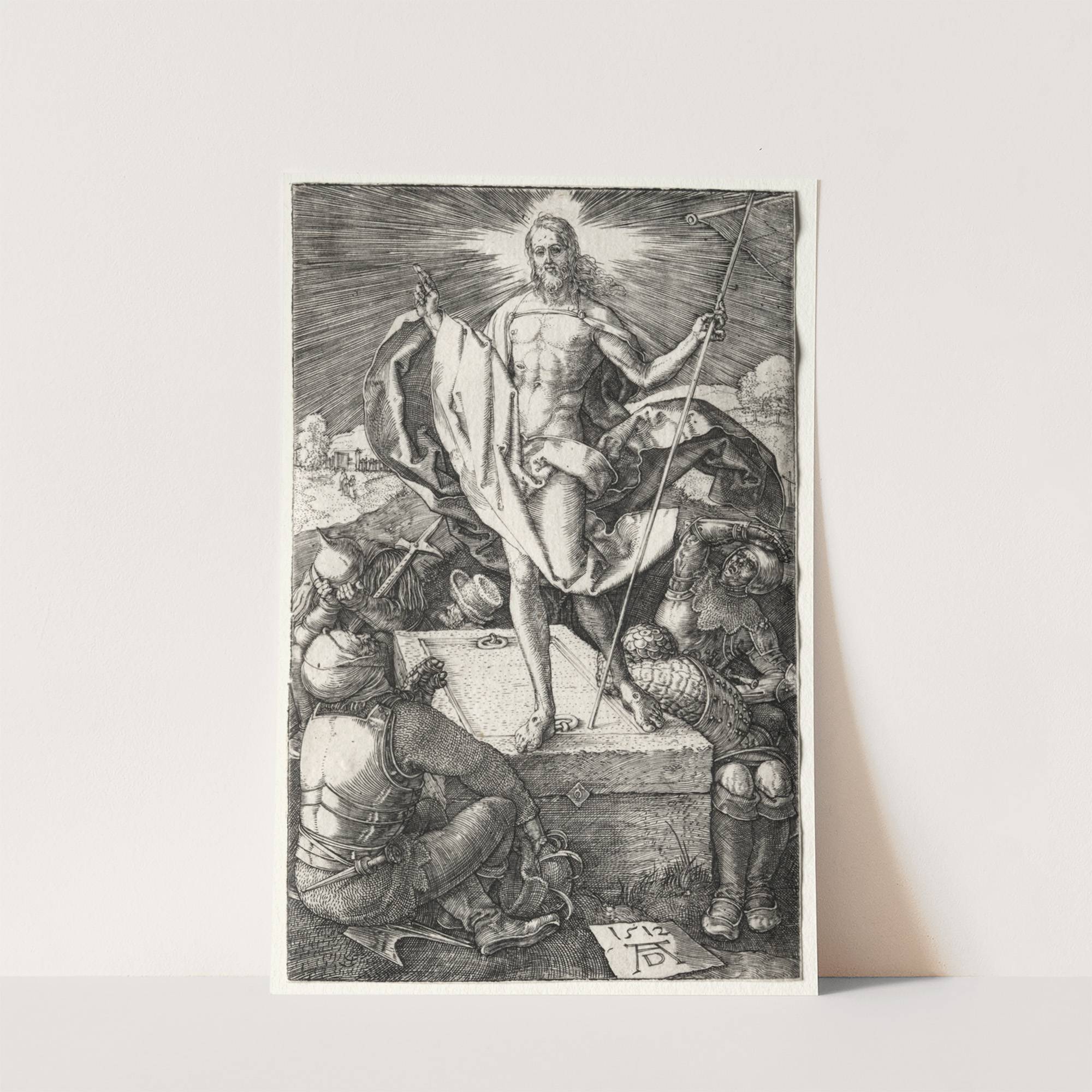 This is a highly detailed black-and-white woodcut print titled "The Resurrection" by Albrecht Dürer, created in 1512. At the center of this striking piece is a radiant figure of Christ standing in a resplendent light. He has a serene expression...
