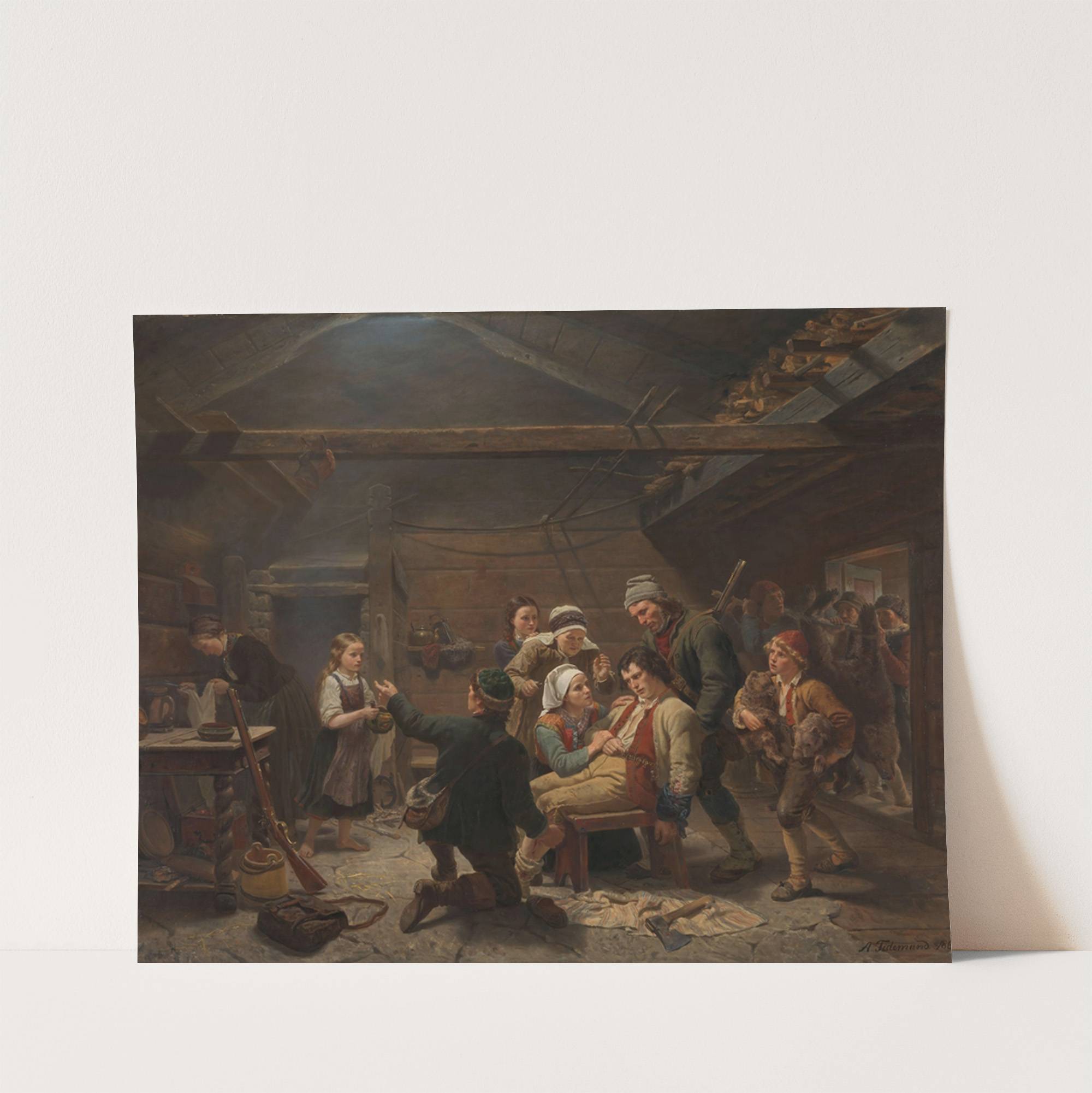 This captivating art print titled "The Return of the Bear Hunter" by Adolph Tidemand showcases a vividly detailed scene set in a rustic wooden cabin during what seems to be a harvest season. The painting is rich with earthy tones...