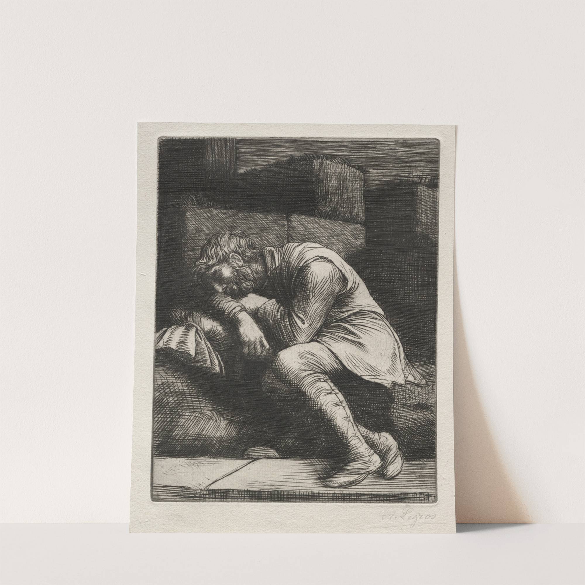 This black-and-white etching by Alphonse Legros depicts "The Sleeping Beggar," a poignant representation of human vulnerability and desperation. The subject is a bearded man with tousled hair, slumped against a stone wall in a crouched position, his head resting on...