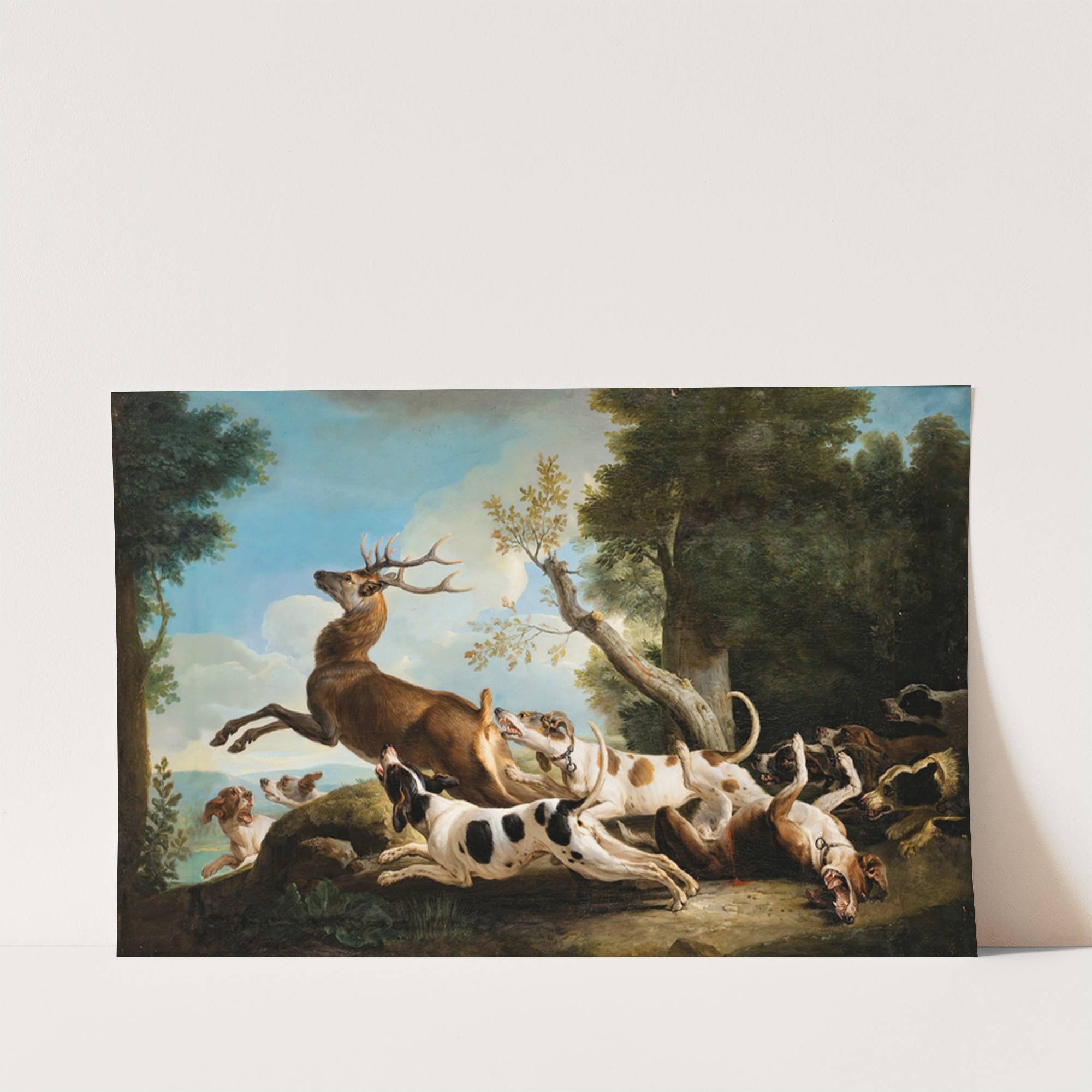 This stunning art print showcases "The Stag Hunt" by Alexandre François Desportes. A dynamic depiction of a hunting scene unfolds beneath a bright blue sky with soft clouds, where a majestic deer with large antlers rears up defiantly at the...