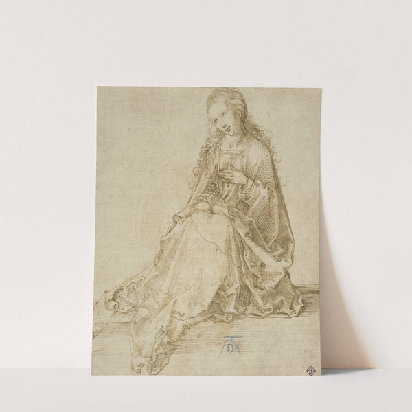 This exquisite artwork is "The Virgin Annunciate" by the renowned artist Albrecht D?rer. Rendered in meticulous black ink on aged parchment, this piece showcases D?rer's exceptional skill in detailed line work and delicate shading. The Virgin Mary is depicted sitting...
