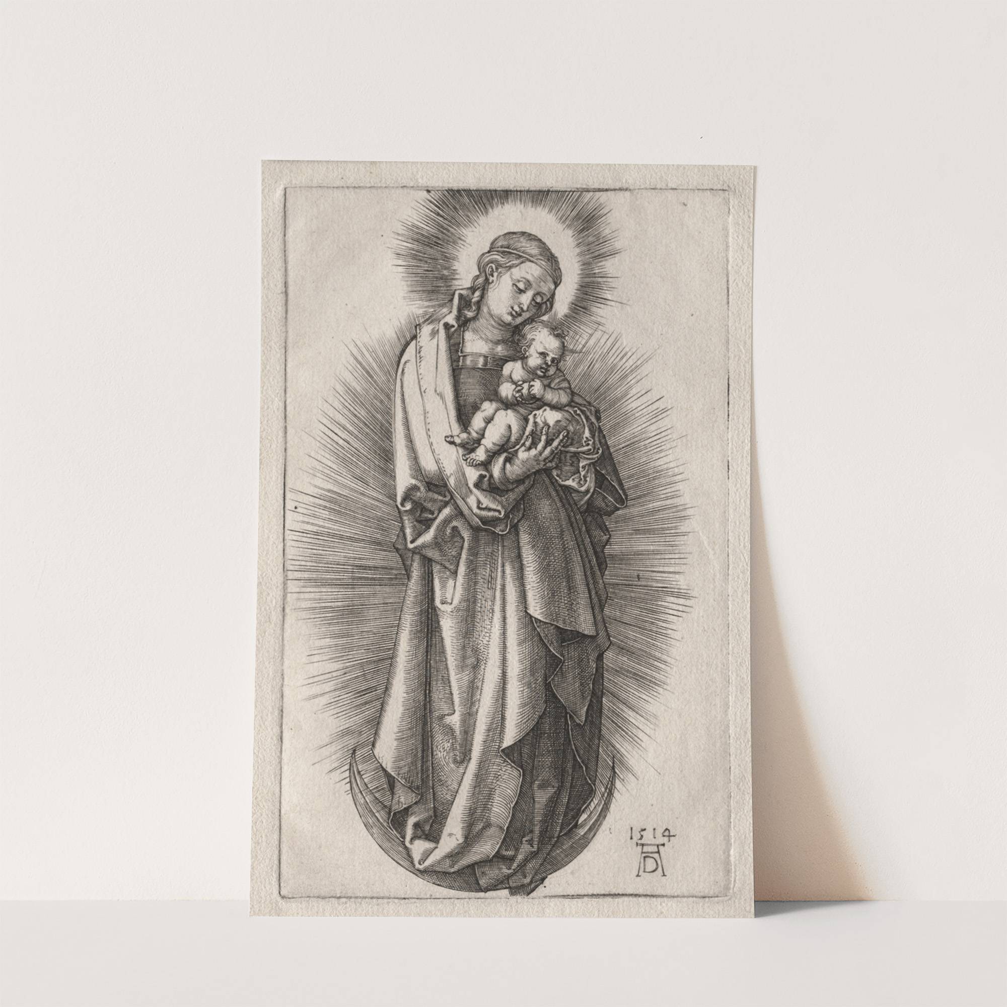 Experience the timeless beauty of "The Virgin with Hairband on a Crescent Moon" by Albrecht Dürer, a masterpiece in black and white. This intricately detailed engraving showcases Mary cradling her baby Jesus tenderly in her arms. Both figures are depicted...