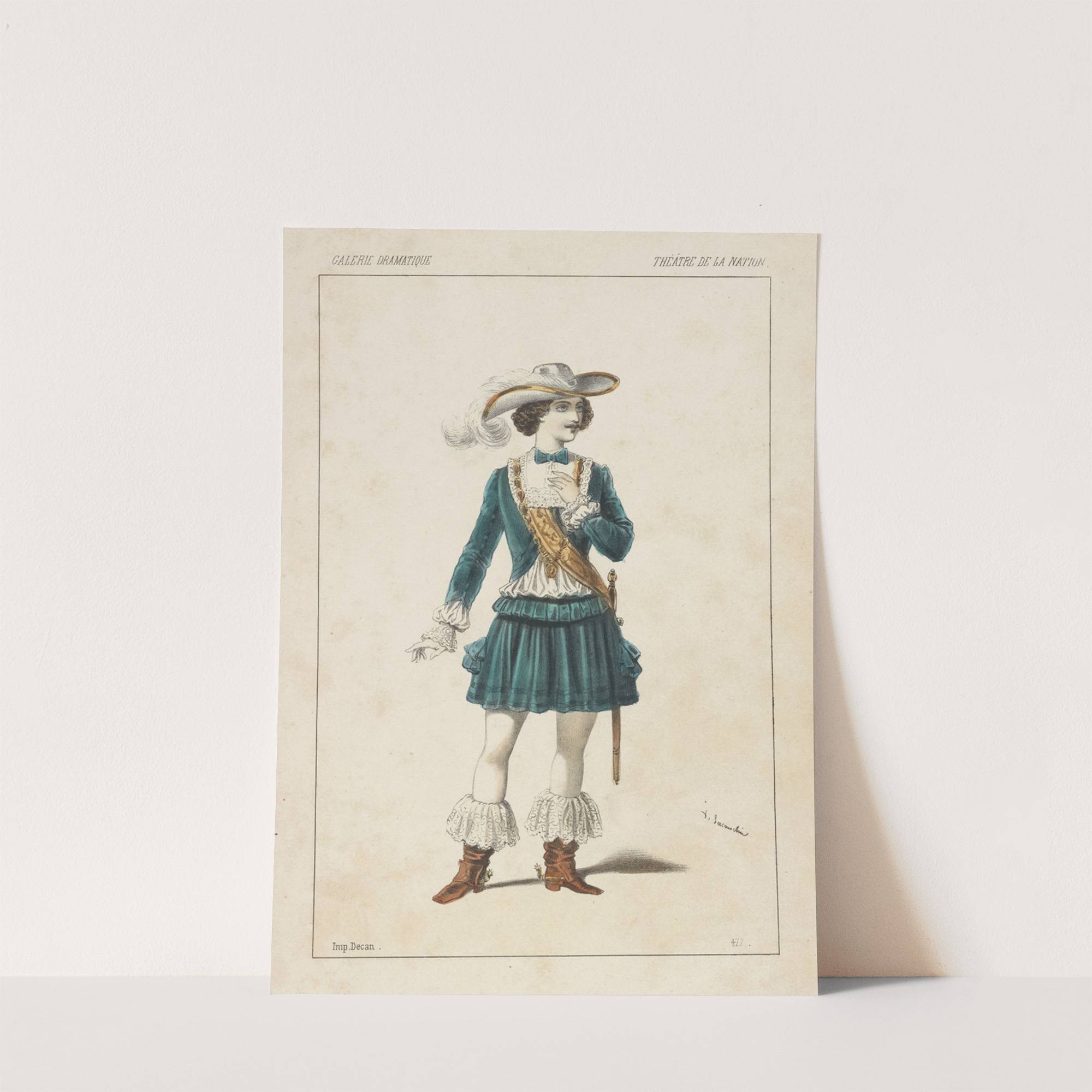This exquisite art print showcases "Théâtre de la Nation" by artist Alexandre Lacauchie, depicting a character in period costume from his work "La Filleule des Fées" created in 1849. The figure is dressed in an elaborate, Regency-style outfit featuring a...